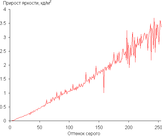 Для оценки характера роста яркости на шкале серого мы измерили яркость 256 оттенков серого (от 0, 0, 0 до 255, 255, 255) при подключении к ПК в режиме RGB, настройка Гамма оставлена в значении по умолчанию (Стандарт). График ниже показывает прирост (не абсолютное значение!) яркости между соседними полутонами: