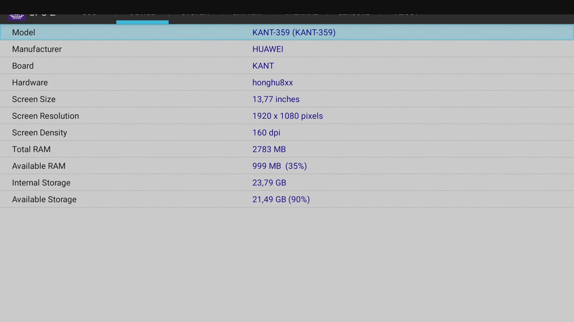 Этот умный экран работает под управлением операционной системы HarmonyOS. Заглавная страница интерфейса проста по дизайну. В нижней части расположена лента из плиток некоторых (пред)установленных приложений, в верхней справа — значки доступа к функциям показа уведомлений, поиска, работы с данными пользователя, вывода главного меню с настройками и подменю подключения к сети. В правом верхнем углу выводится текущее время.