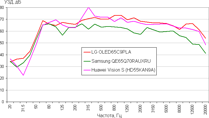 Громкость встроенной акустической системы для жилой комнаты, соответствующей по размерам данной диагонали экрана, достаточная. Стереофонический выражен хорошо, но звук отчетливо идет снизу. Присутствуют средние и высокие частоты, и даже ощутимое количество низких. Явно есть паразитные резонансы корпуса, звук резковат, однако в целом для класса встроенной в телевизор акустики ее качество хорошее. Сравним АЧХ этого ТВ с АЧХ двух телевизоров высшего класса (получена с помощью шумомера при воспроизведении звукового файла с розовым шумом, интервал УЗД в 1/3 октавах):