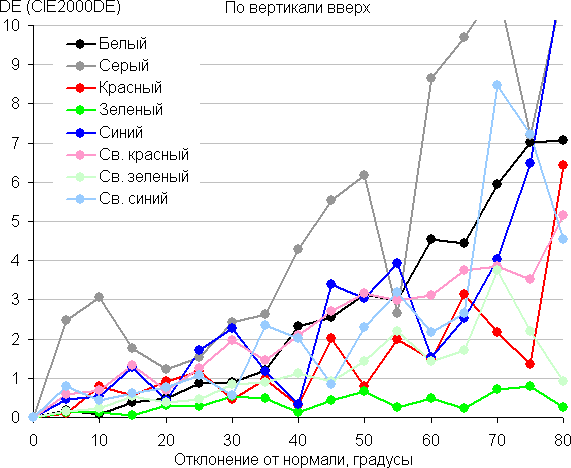 Для количественной характеристики изменения цветопередачи мы провели колориметрические измерения для белого, серого (127, 127, 127), красного, зеленого и синего, а также светло-красного, светло-зеленого и светло-синего полей во весь экран с использованием установки, подобной той, что применялась в предыдущем тесте. Измерения проводились в диапазоне углов от 0° (датчик направлен перпендикулярно к экрану) до 80° с шагом в 5°. Полученные значения интенсивностей были пересчитаны в отклонение ΔE относительно замера каждого поля при перпендикулярном положении датчика относительно экрана. Результаты представлены ниже: