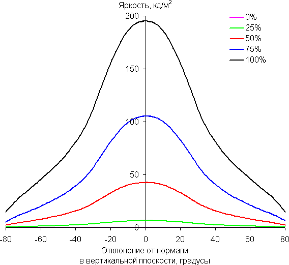 По скорости снижения яркости углы обзора не самые плохие. При отклонении в диагональном направлении яркость черного поля начинает резко возрастать уже при 20°-30° отклонения от перпендикуляра к экрану. Если сидеть не очень далеко от экрана, то черное поле по углам будет заметно светлее, чем в центре, но оставаться условно нейтрально-серым. Контрастность в диапазоне углов ±82° в случае отклонения по диагонали в одном направлении опускается ниже отметки 10:1 при −78°.