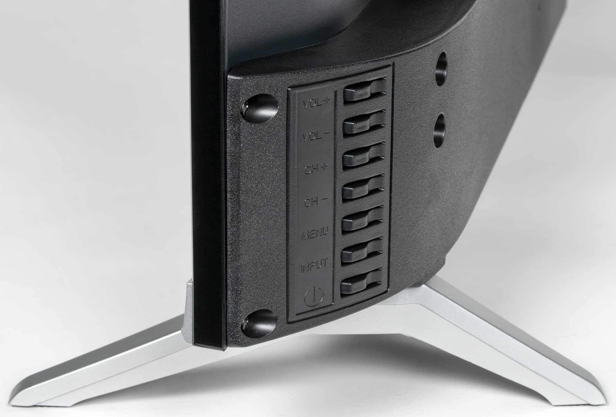 Экран визуально безрамочный, он выглядит как монолитная поверхность, ограниченная снизу узкой планкой, а сверху и с боков — узкой окантовкой. Окантовка изготовлена из пластика с черной глянцевой поверхностью. Планка также пластиковая, но уже с серебристым покрытием. Ножки — аналогично пластиковые с серебристым покрытием. Поверхности планки и ножек могут отсвечивать, что будет слегка мешать просмотру ТВ. Выведя изображение на экран, можно увидеть, что на самом деле между внешними границами экрана и собственно областью отображения есть неширокие поля (от области отображения до внешних границ экрана сверху и с боков по 10 мм, а снизу — 20 мм). По центру фронтальной планки располагается логотип из наклеенных пластиковых букв с металлизированной зеркально-гладкой поверхностью