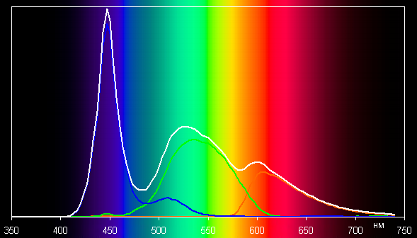 Ниже приведен спектр для белого поля (белая линия), наложенный на спектры красного, зеленого и синего полей (линии соответствующих цветов):