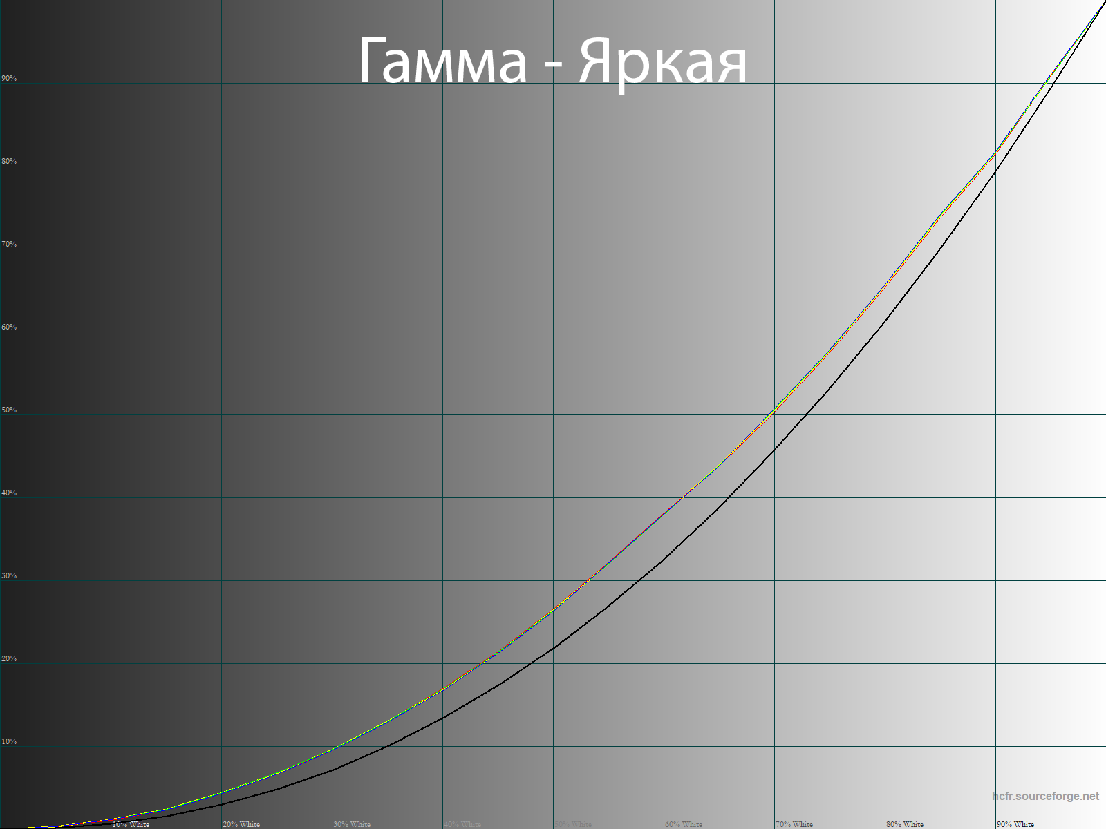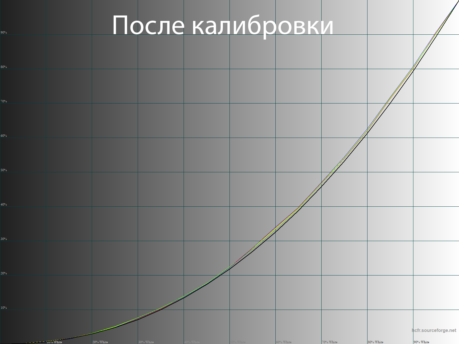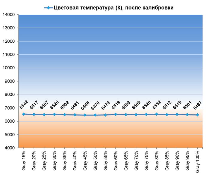 После калибровки точка белого и все точки серого клина пришли в норму, баланс изображения стал нейтральным — без проявленных паразитных оттенков. Стабильность ЦТ оттенков серого вышла на свой максимальный уровень — график выше тому в подтверждение.