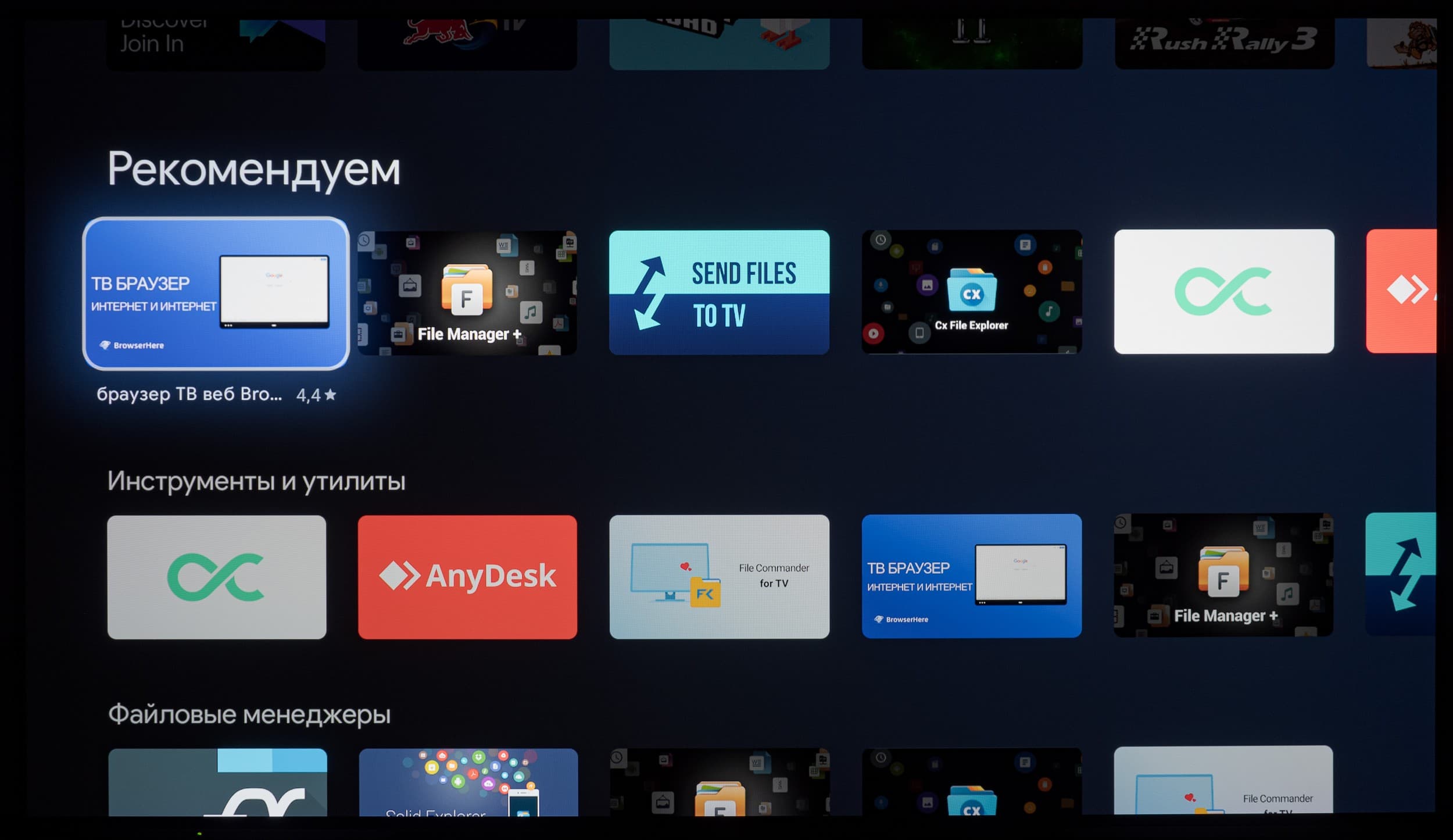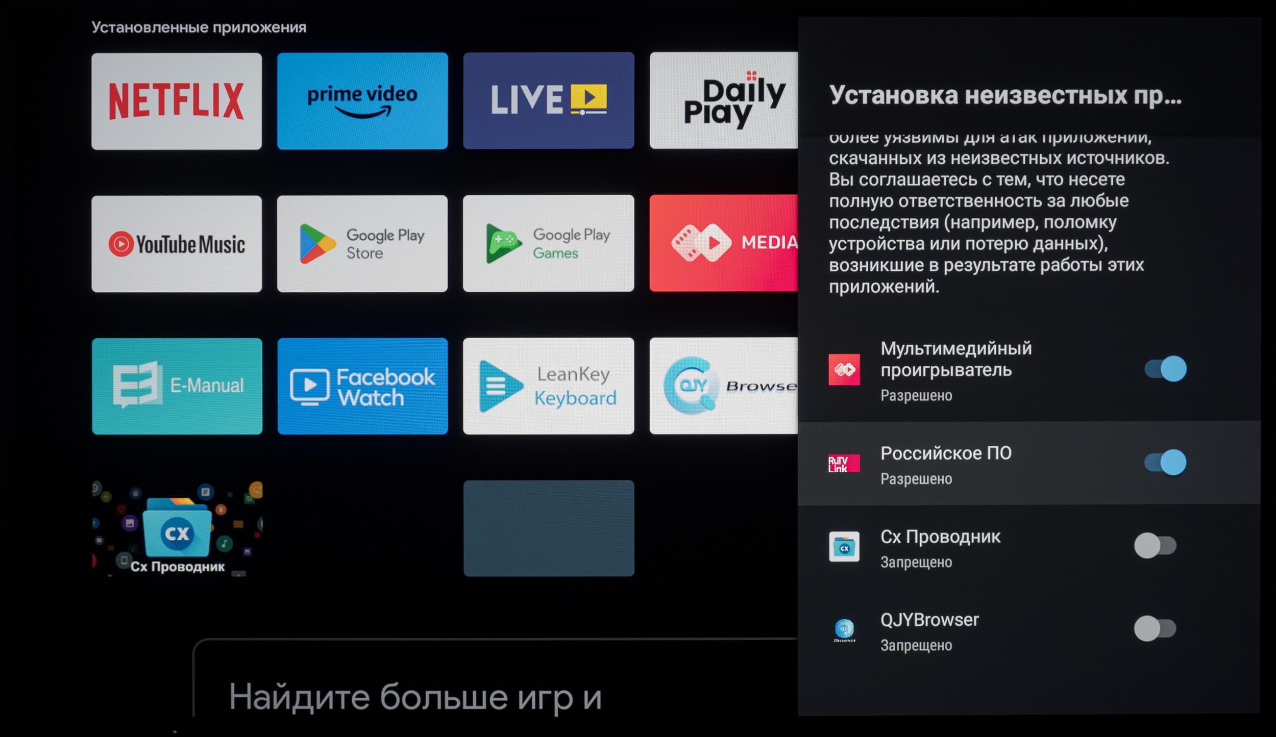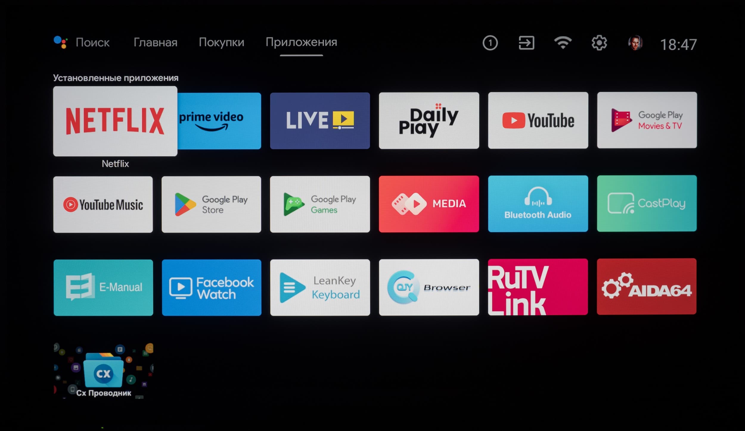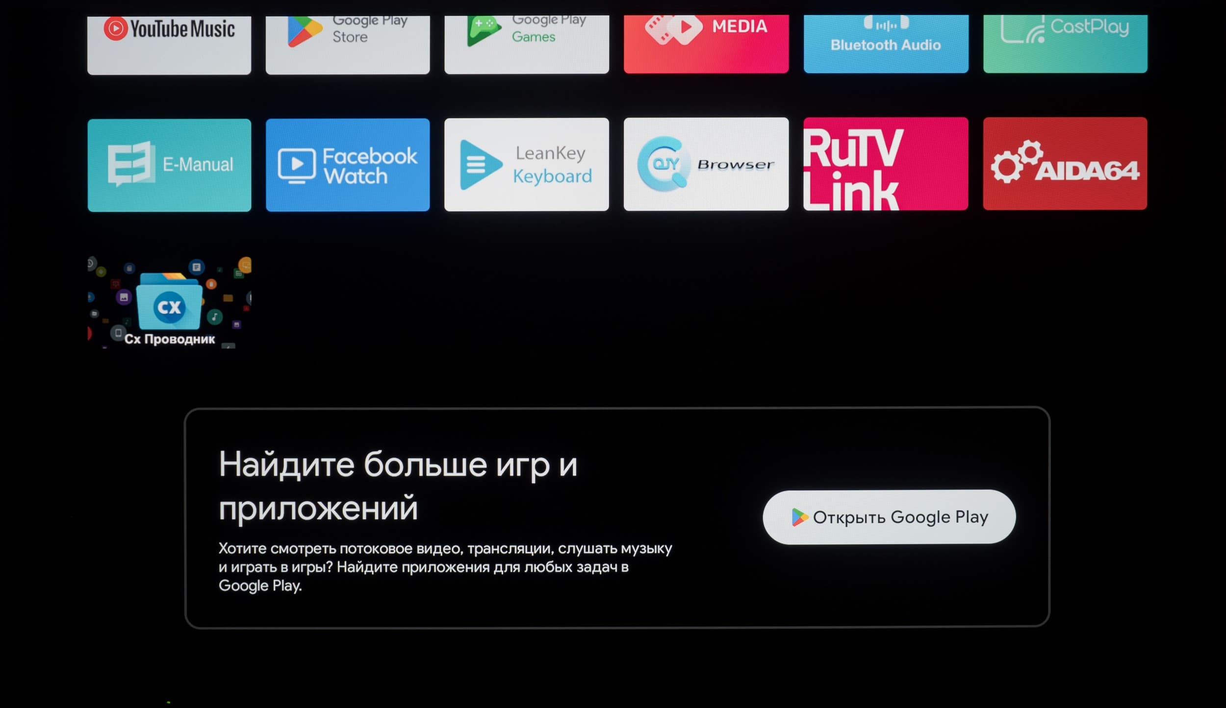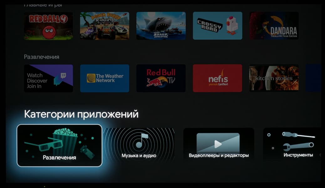 В самом же Google Play официально доступных приложений для платформы Android TV не так много, но пользователя это практически не ограничивает, ведь телевизор способен переварить многие подходящие для используемой программно-аппаратной платформы APK-инсталляторы — лишь бы на нужное вам приложение хватило мощности встроенной в ТВ начинки.