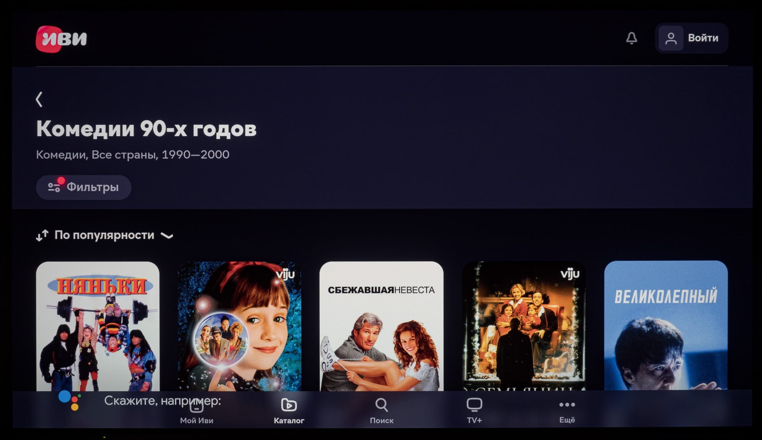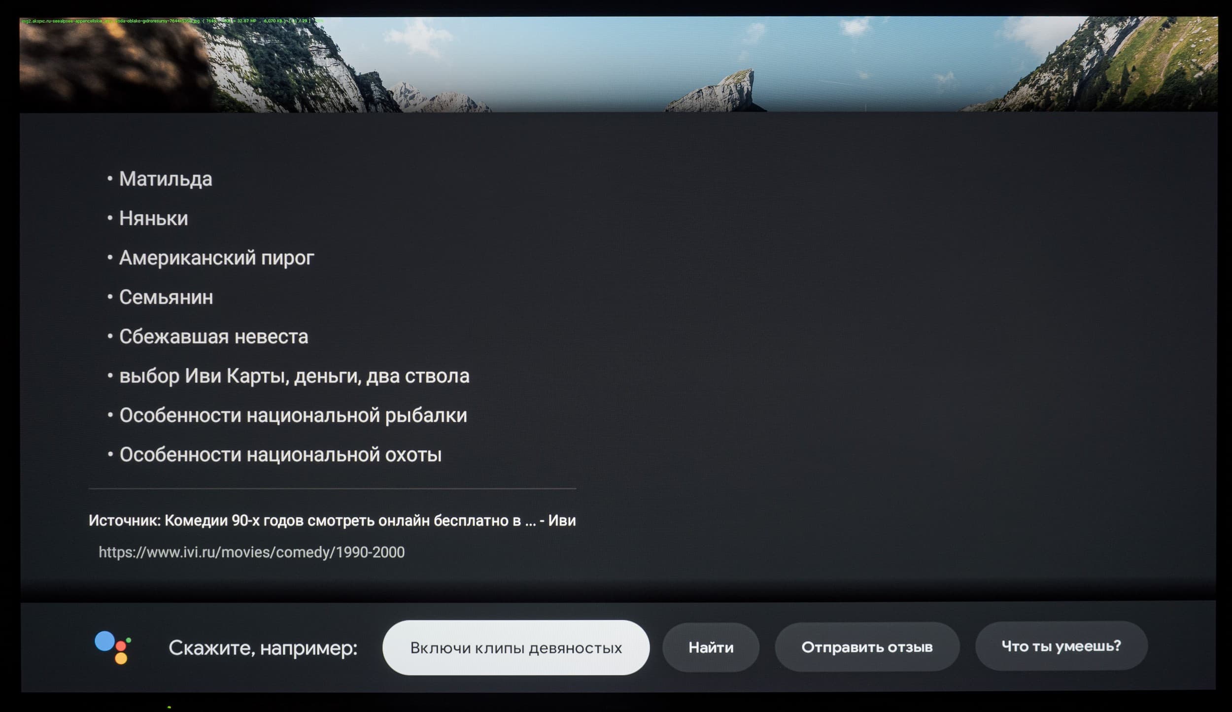 На слова и фразы, не распознанные как команды, выполняется поиск, и в результатах поиска будет предложен развлекательный контент, в том числе из YouTube, а иногда открывается страница приложения в магазине Google Play или даже некоторые онлайн-кинотеатры (пример выше с Иви) с названием, соответствующим поисковой фразе.