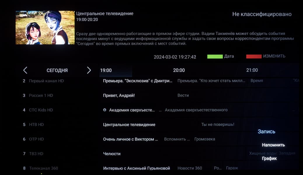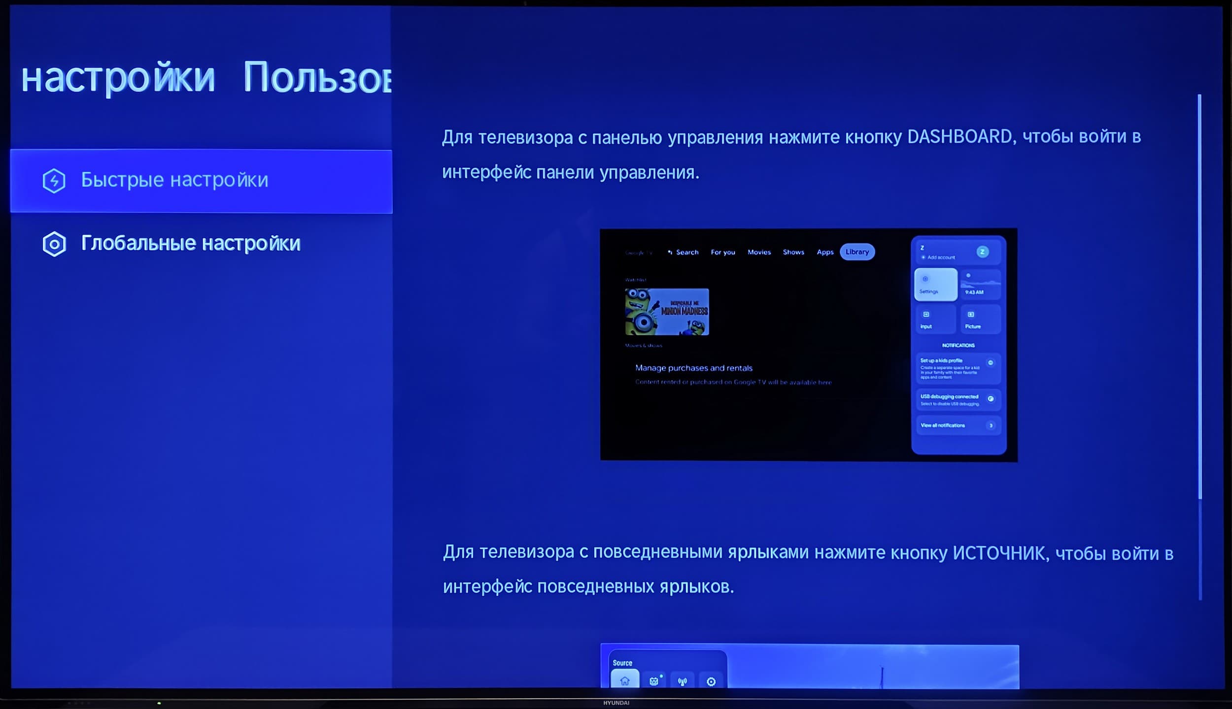 Отдельно добавим, что управлять ТВ Hyundai можно с мобильного устройства с помощью одного из приложений, имитирующих пульт ДУ для телевизоров под управлением Android TV. Выделим и встроенное электронное руководство, способное ответить на бо́льшую часть вопросов покупателей, связанных с работой ТВ и его программной оболочки.