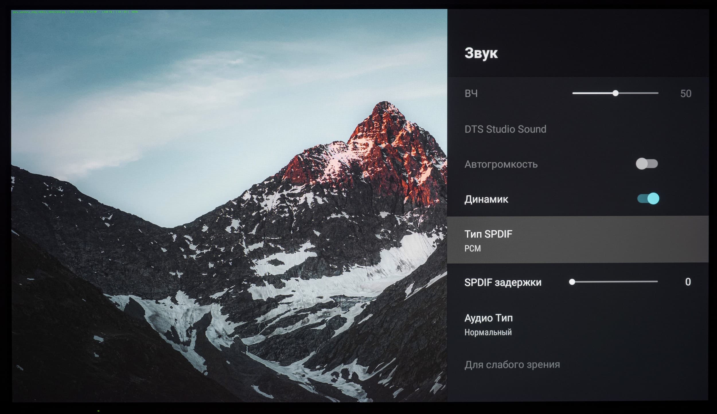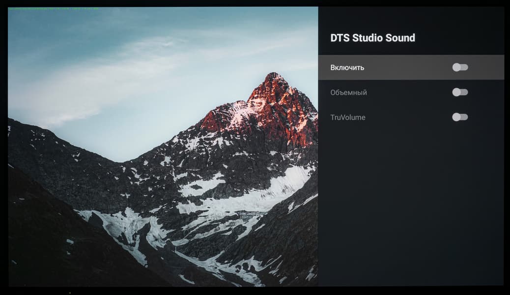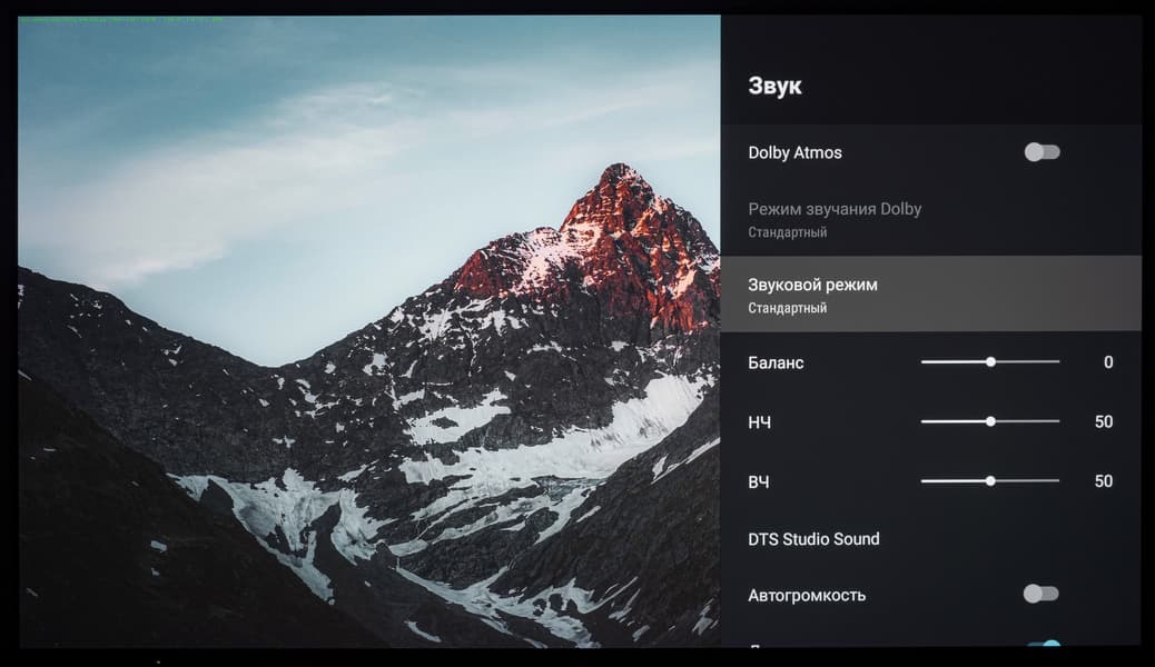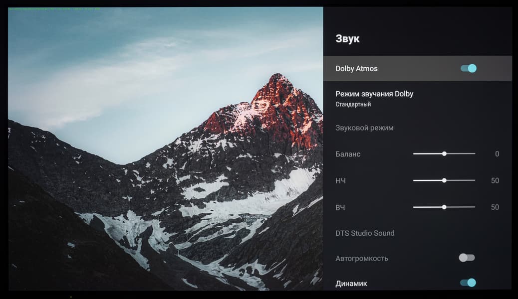 В разделе «Звук» операционной системы есть предустановленные режимы эквалайзера, а также доступна ручная регулировка баланса, корректировка низких и высоких частот, активация поддержки Dolby Atmos со своими предустановками-режимами эквалайзера, функция автоматического управления громкостью (актуально для источников с сильно отличающимся уровнем аудиосигнала), выбор цифрового выхода, включение обработки DTS Studio Sound c активаций «Объемного режима».