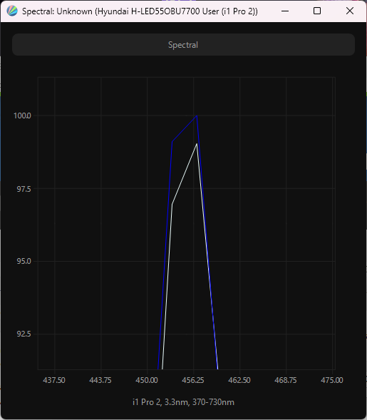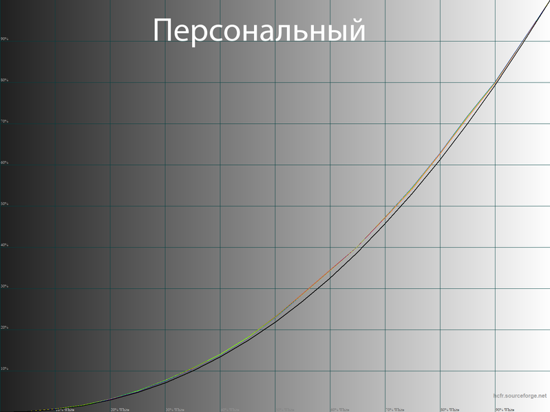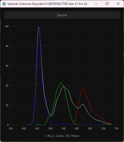 Виден сдвинутый пик синего, приходящийся на 456 нм, что обеспечивает снижение нагрузки на глаза и возможность получения различных современных сертификатов безопасности. Видно, что спектры компонент хорошо разделены, что и позволяет получить широкий цветовой охват. Перекрестное подмешивание незначительное, то есть цветовой охват в случае профиля «Персональный» близок к оригинальному охвату экрана ТВ.