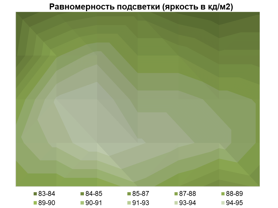 Измерения яркости проводились в 35 точках экрана, расположенных с шагом 1/6 от ширины и высоты экрана. Границы экрана не включены, настройки установлены в значения, обеспечивающие яркость белого поля в 92 нит в центральной части экрана.