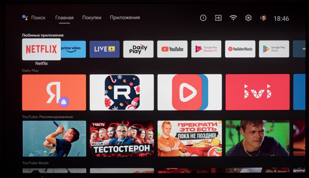 Главный экран в Android TV многим хорошо знаком и представляет собой несколько горизонтальных лент с плитками избранных установленных приложений, избранного контента и рекомендуемого контента, предоставляемого различными программами, в том числе с разбивкой на каналы. Надписи слева над лентами поясняют, к чему относится содержимое лент.