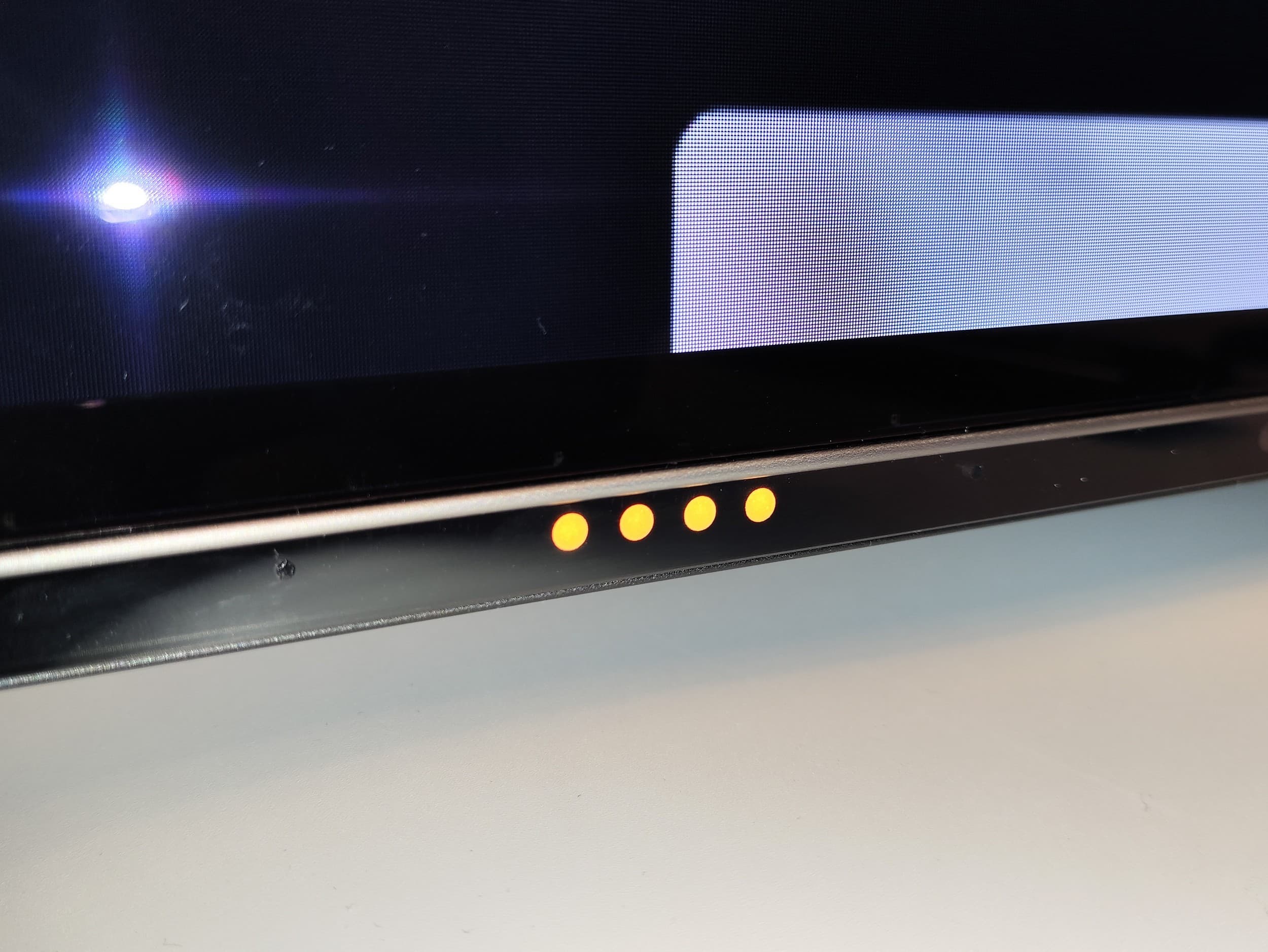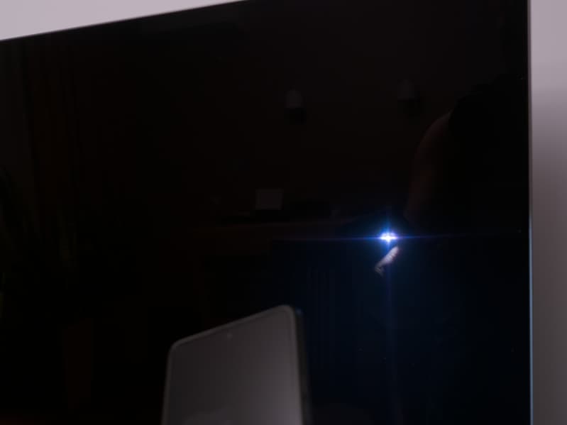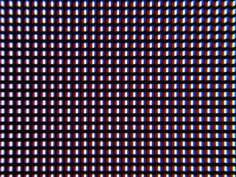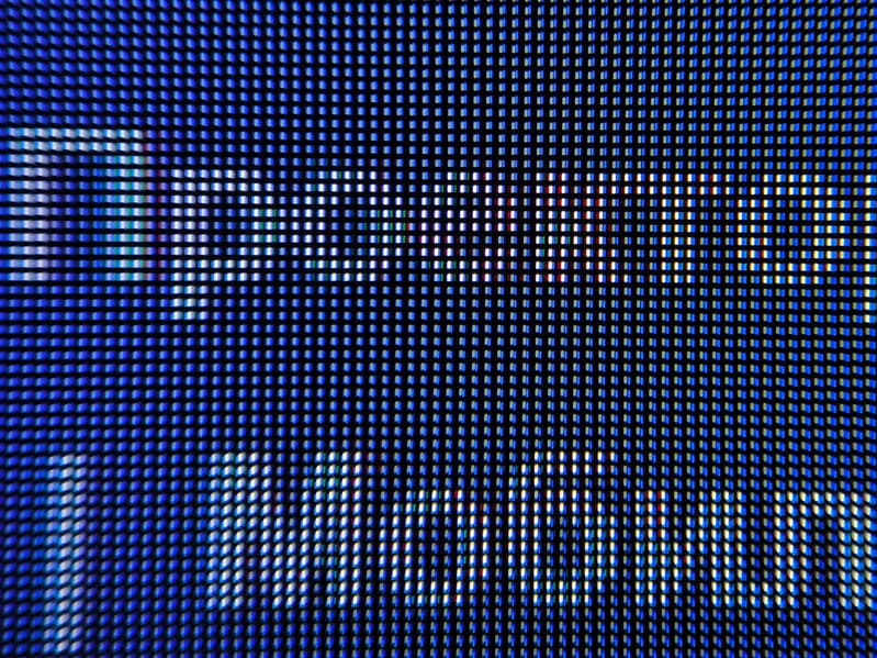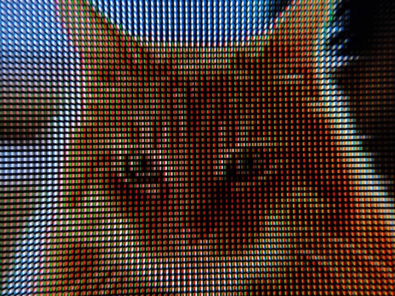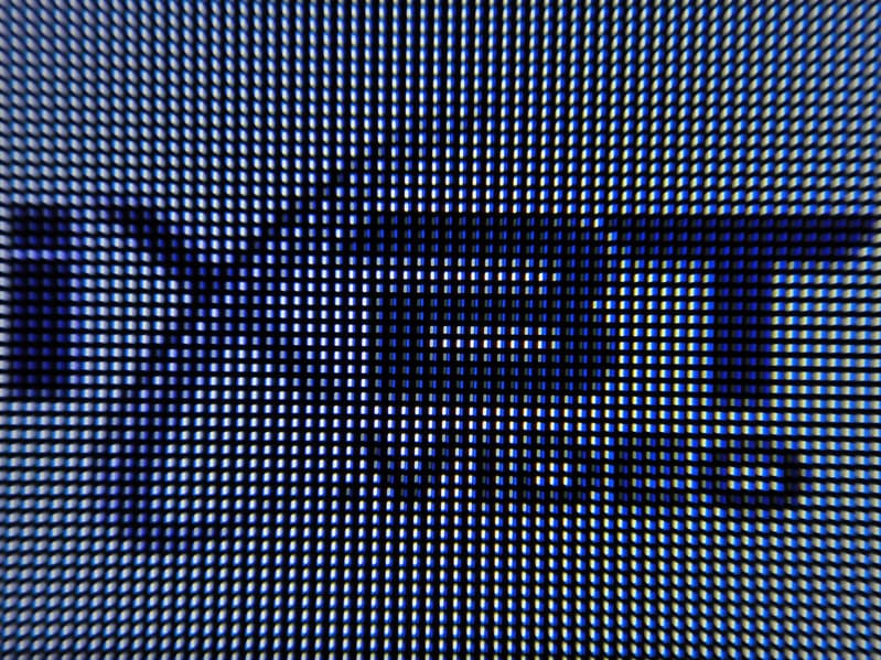 Фокусировка на поверхности экрана выявила еле заметные хаотично расположенные микродефекты поверхности, отвечающие за антибликовые свойства. Антибликовый фильтр достаточно хорошо исполняет свою роль, а глянцевая поверхность матрицы улучшает визуальный контраст и делает картинку более гладкой.