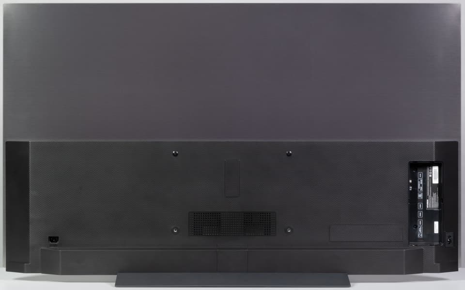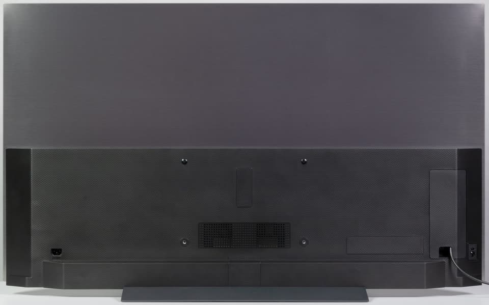 Сзади телевизор выглядит аккуратно. Задняя панель в верхней части изготовлена из тонкого листа стали и имеет стойкое серое матовое покрытие с легким эффектом шлифовки и фиолетовым отливом на свету. Сверху и с боков панель заходит на торцы и образует окантовку экрана. Выступающий назад двухуровневый кожух изготовлен из черного пластика с матовой, фактурной поверхностью с ромбовидным рисунком. Есть одна вентиляционная решетка посередине.