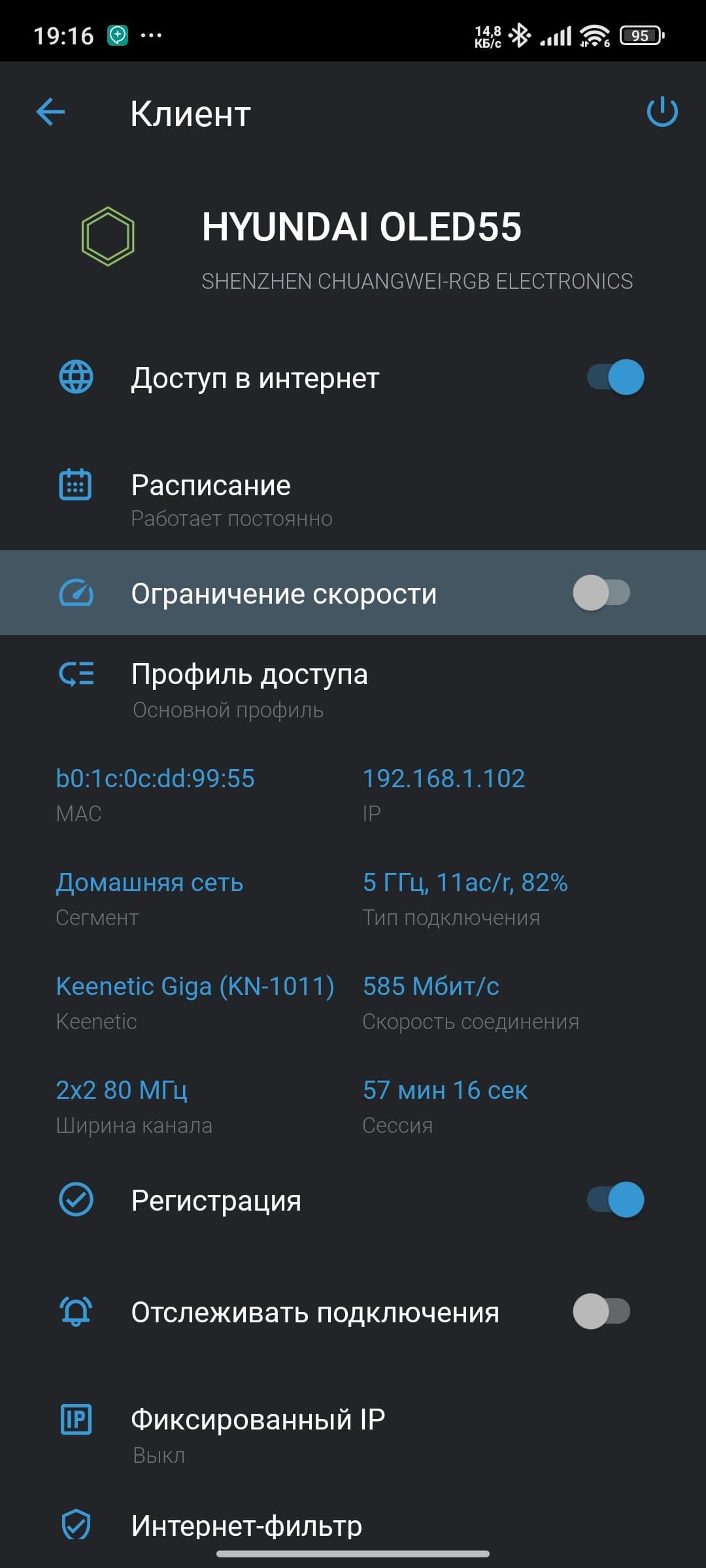 В развернутой сети 5 ГГц на базе роутера Keenetic Giga, при нахождении телевизора в 5 метрах по прямой от него с преградой в виде монолитной стены, телевизор Hyundai продемонстрировал стабильную скорость подключения в 585 Мбит/c (тип подключения — 11ac/r, 2×2 80 МГц), которая иногда становилась выше. Это очень достойный результат.