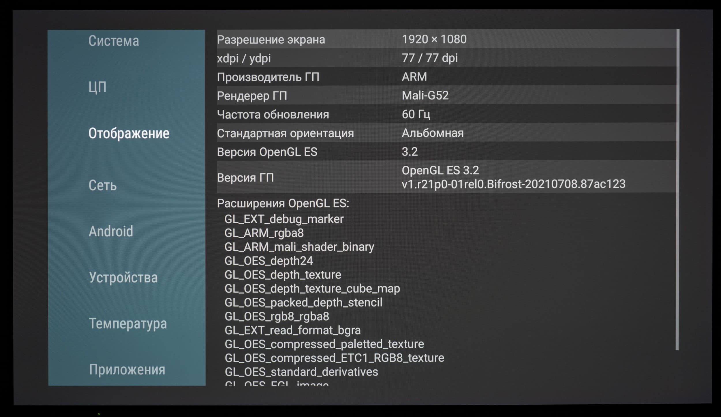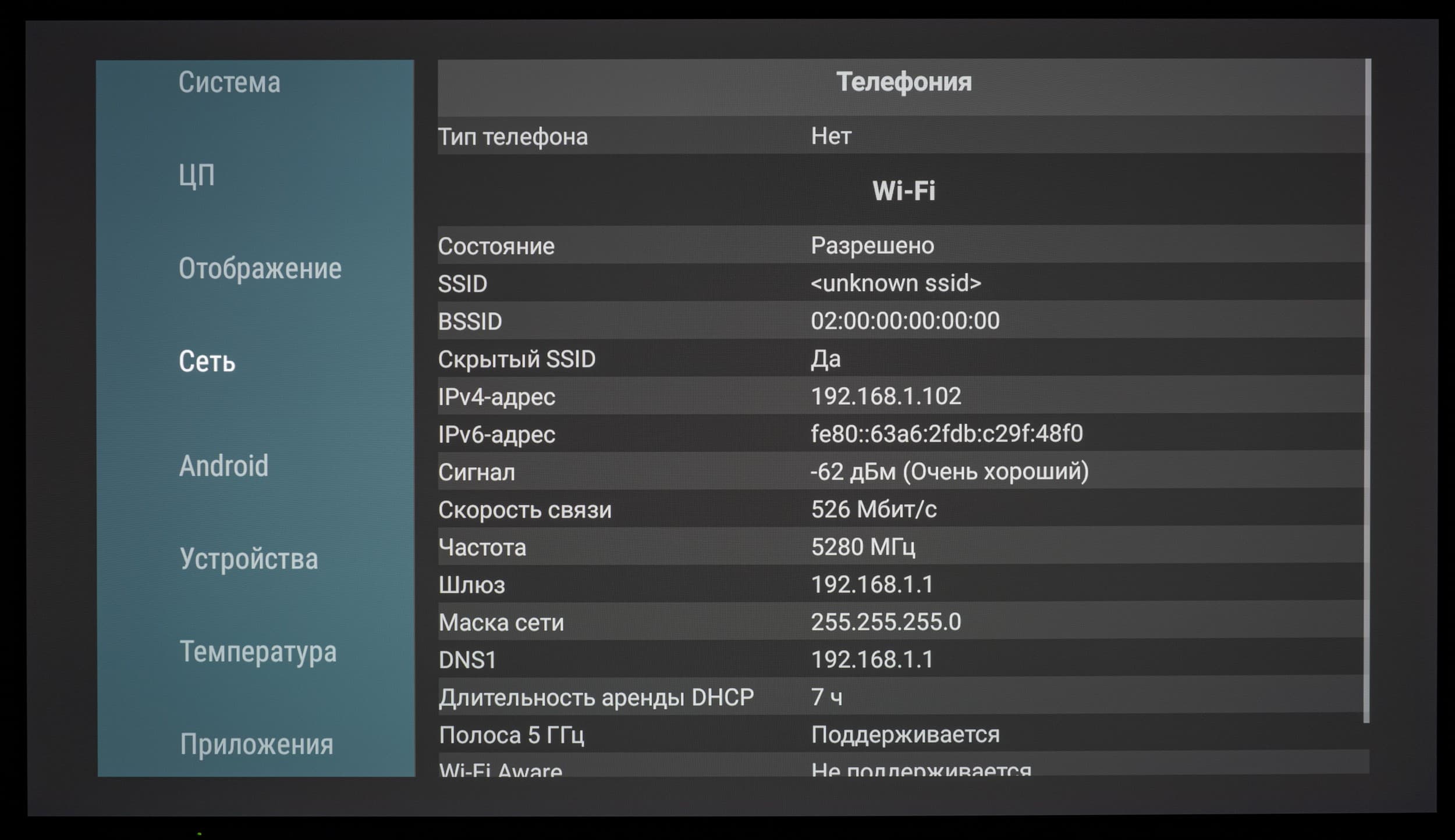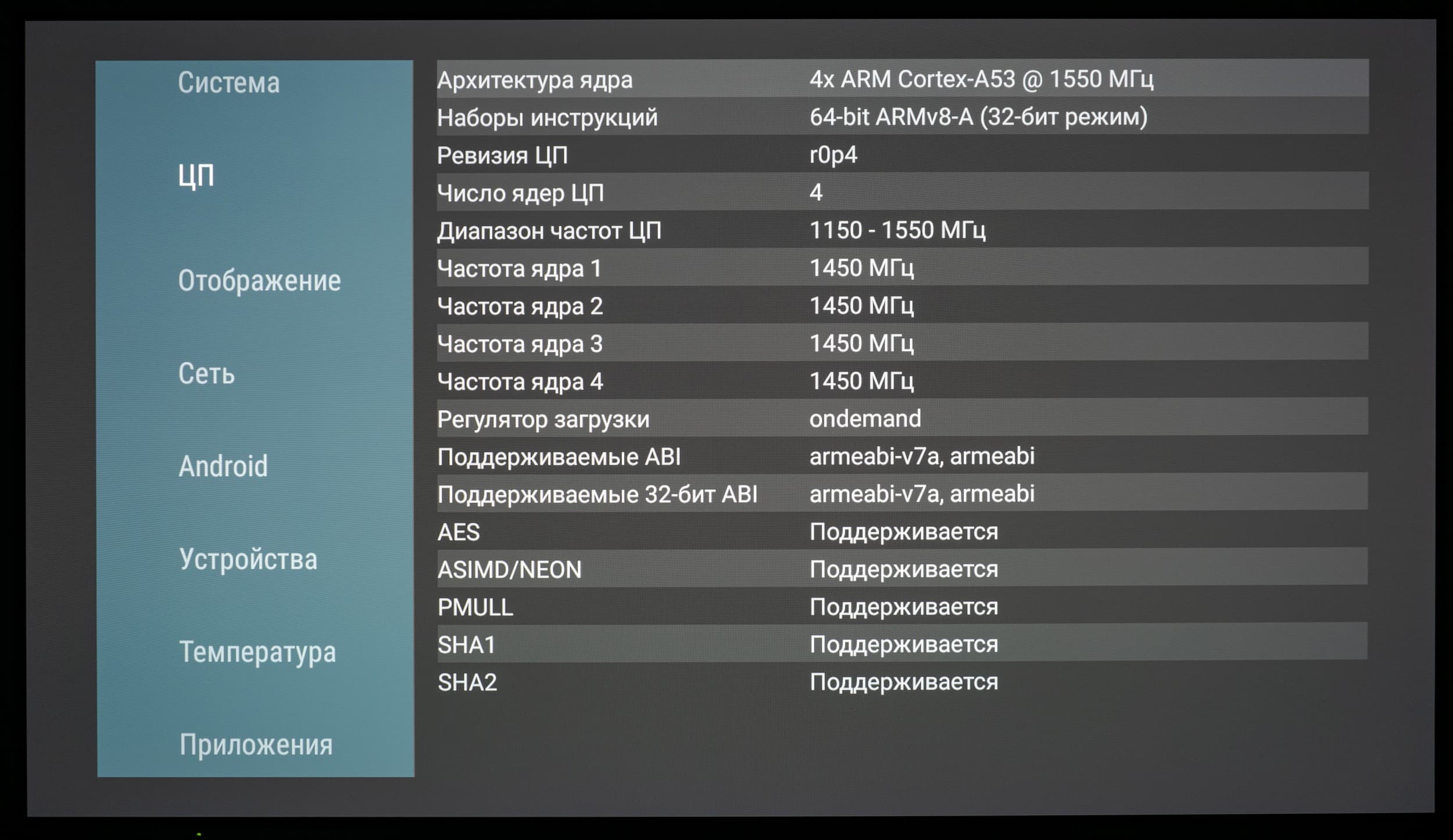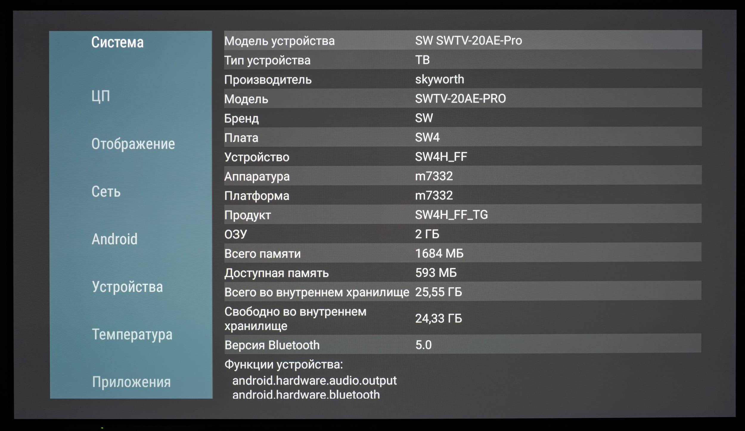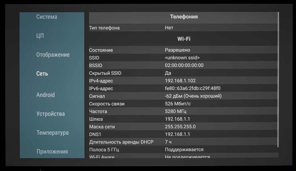 После установки информационного приложения AIDA64 через скачанный APK-файл мы получили доступ к информации по конфигурации аппаратной части рассматриваемого телевизора: