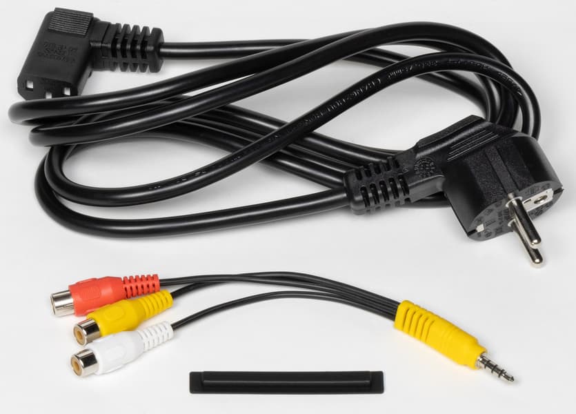 Комплект поставки расширен с помощью переходника AV с RCA на 3,5 мм и заглушки интерфейса для установки модуля CI+. Кабель питания съемный, с Г-образным штекером.