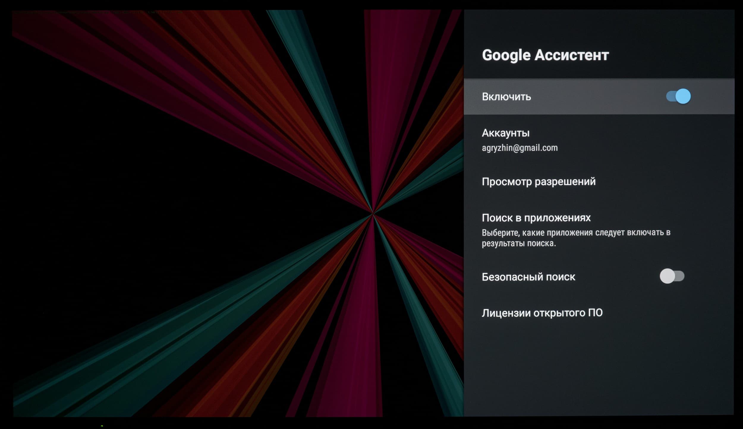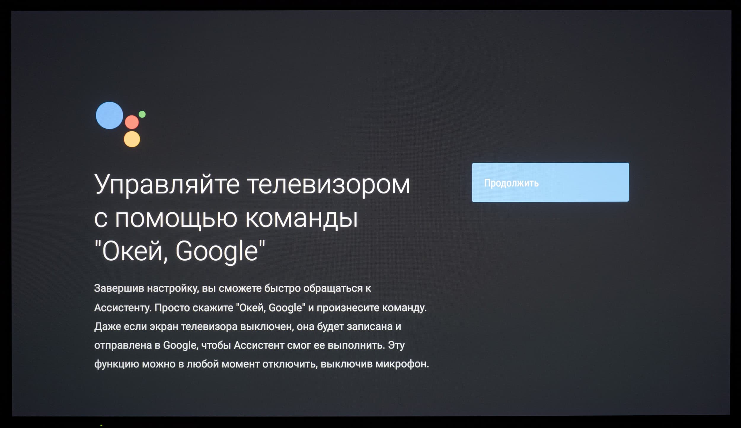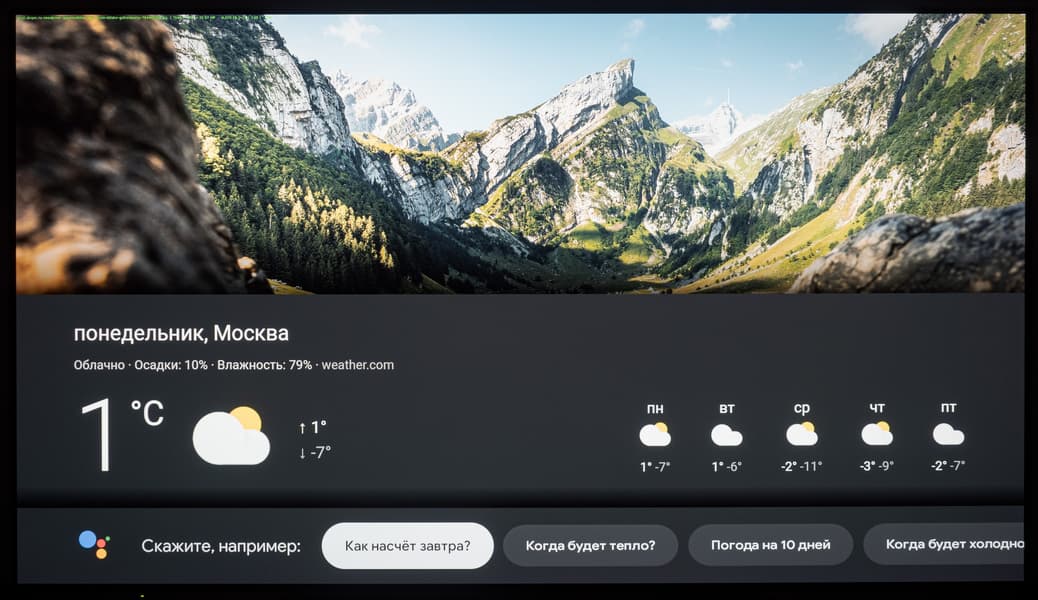 Голосовой помощник Google запускается при нажатии на кнопку с цветными кружками (для ввода голосовой команды держать ее не нужно, а при включенном микрофоне на пульте горит красный индикатор), также его можно запустить с домашней страницы или нажатием на мультимедийную кнопку поиска на цифровой клавиатуре. Этот помощник поможет найти контент, который предоставляют ряд программ, и ответить на какие-то вопросы (показывая и проговаривая ответ), например какая сейчас погода за окном.