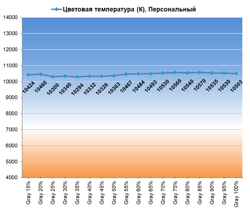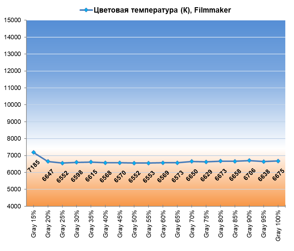 При заводских настройках наблюдаются проблемы с установкой точки белого (10500 К) и ЦТ оттенков серого. Быстро поправить баланс можно установкой ЦТ в настройках телевизора в положение «Теплый» либо переходом в режим Filmmaker. Мы же пошли по пути ручной настройки с полноценными правками усиления RGB.