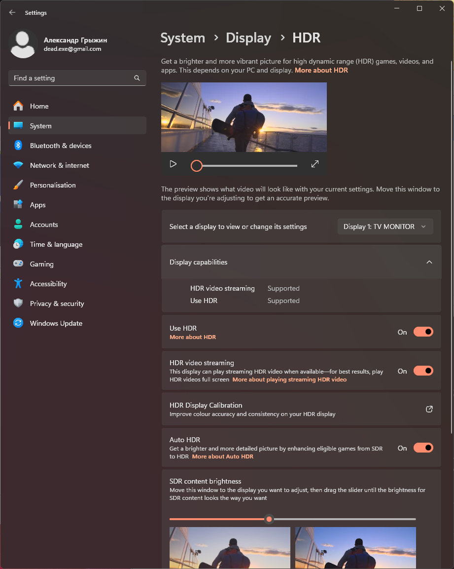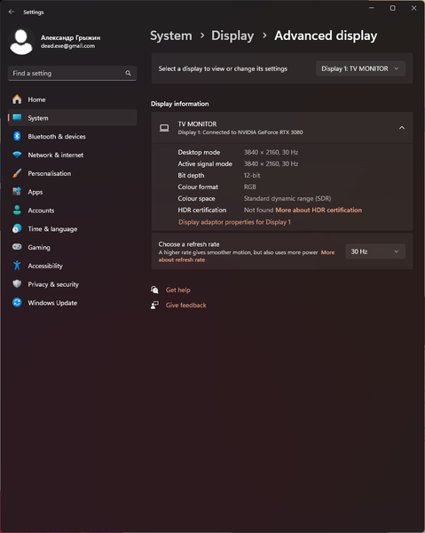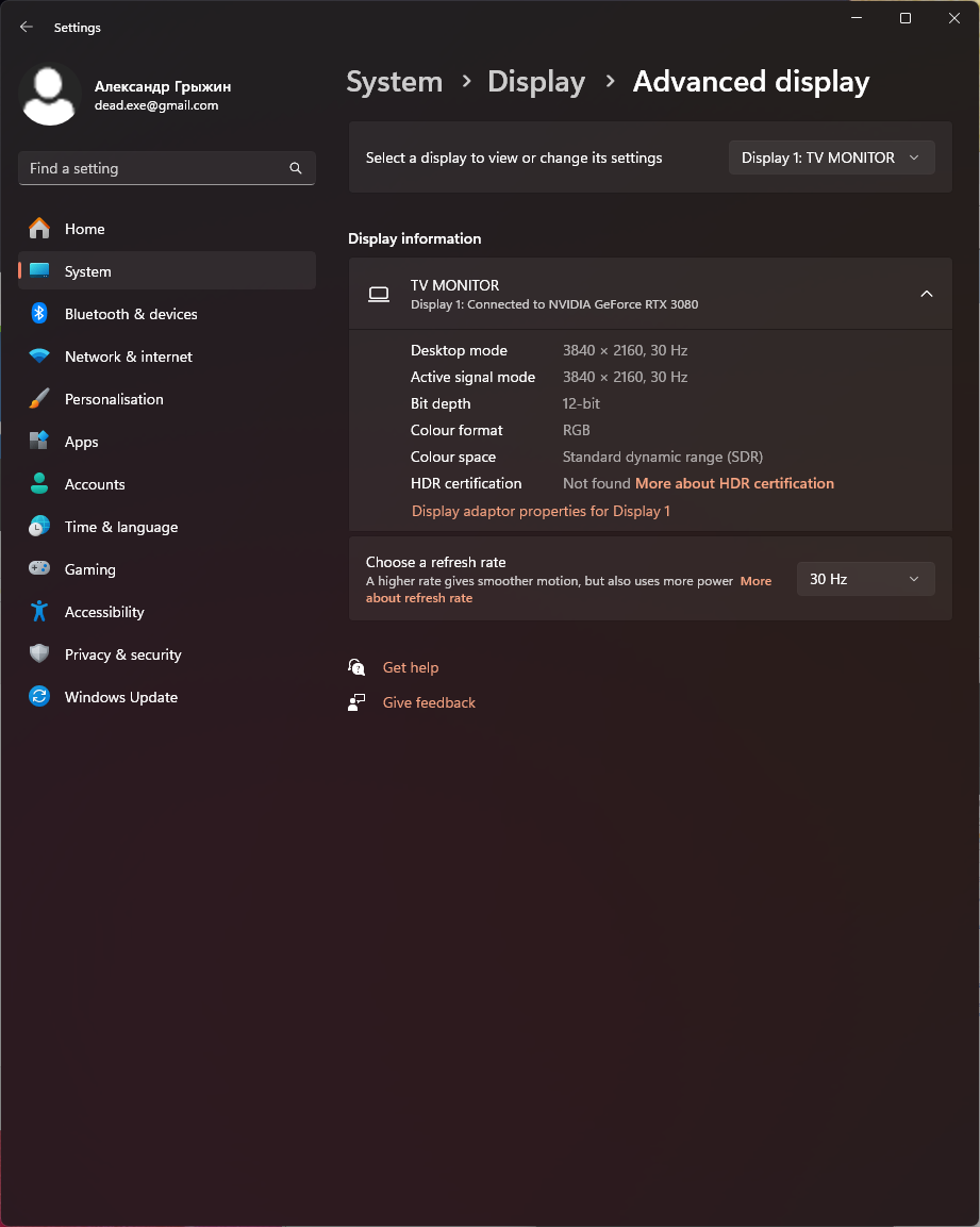 Под Windows 11 вывод в режиме HDR на данный телевизор возможен при выборе соответствующих опций в настройках дисплея. При разрешении 4K UHD и 50/60 Гц вывод идет исключительно в режиме 8 бит на цвет. В случае снижения частоты развертки до 30 Гц возможна активация 10-12-битного режима, что может быть полезно при выводе соответствующего контента.