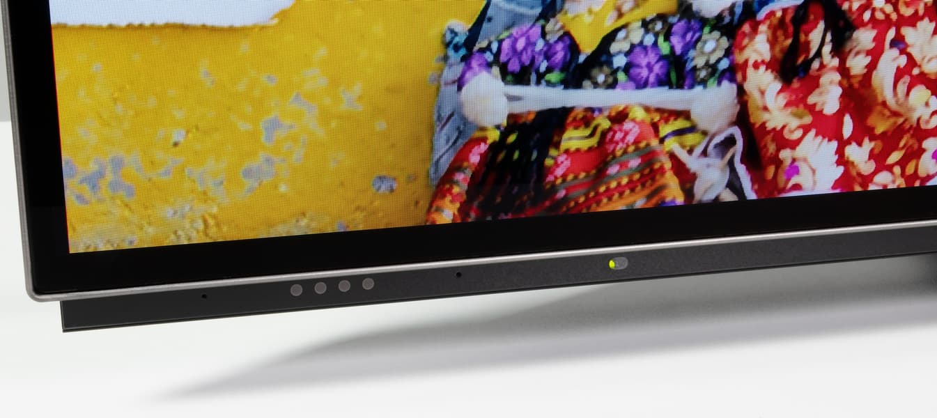 Спереди снизу есть полупрозрачная накладка из пластика с серой подложкой во всю ширину корпуса. На ней размещены индикатор питания, ИК-приемник пульта ДУ, два микрофона и четыре световых индикатора системы Far Field, отвечающей за работоспособность ассистента Google без использования пульта управления телевизором.