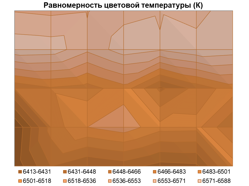 Нет их и к равномерности цветовой температуры: среднее отклонение от центральной точки составило всего 0,7%, а максимальное — 1,5%. Вариация ЦТ не превышает 200 К, а в ходе измерений стало понятно, что цветовая температура еле заметно снижается сверху вниз.
