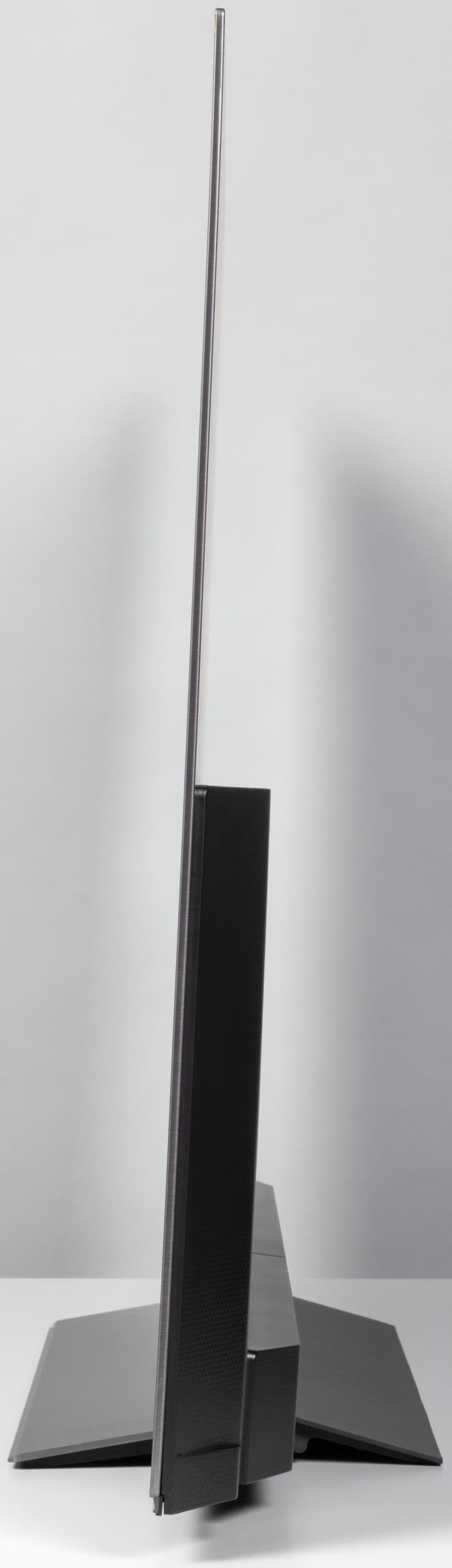 Если учитывать только корпус самой OLED-панели, то телевизор смотрится очень тонким. Побочным следствием такой тонкости является относительно низкая жесткость корпуса. При манипуляциях с этим телевизором его нельзя брать за углы — только ближе к середине, иначе корпус можно погнуть, а в худшем случае — повредить матрицу. Но это особенность практически любого OLED-телевизора вне зависимости от его класса.