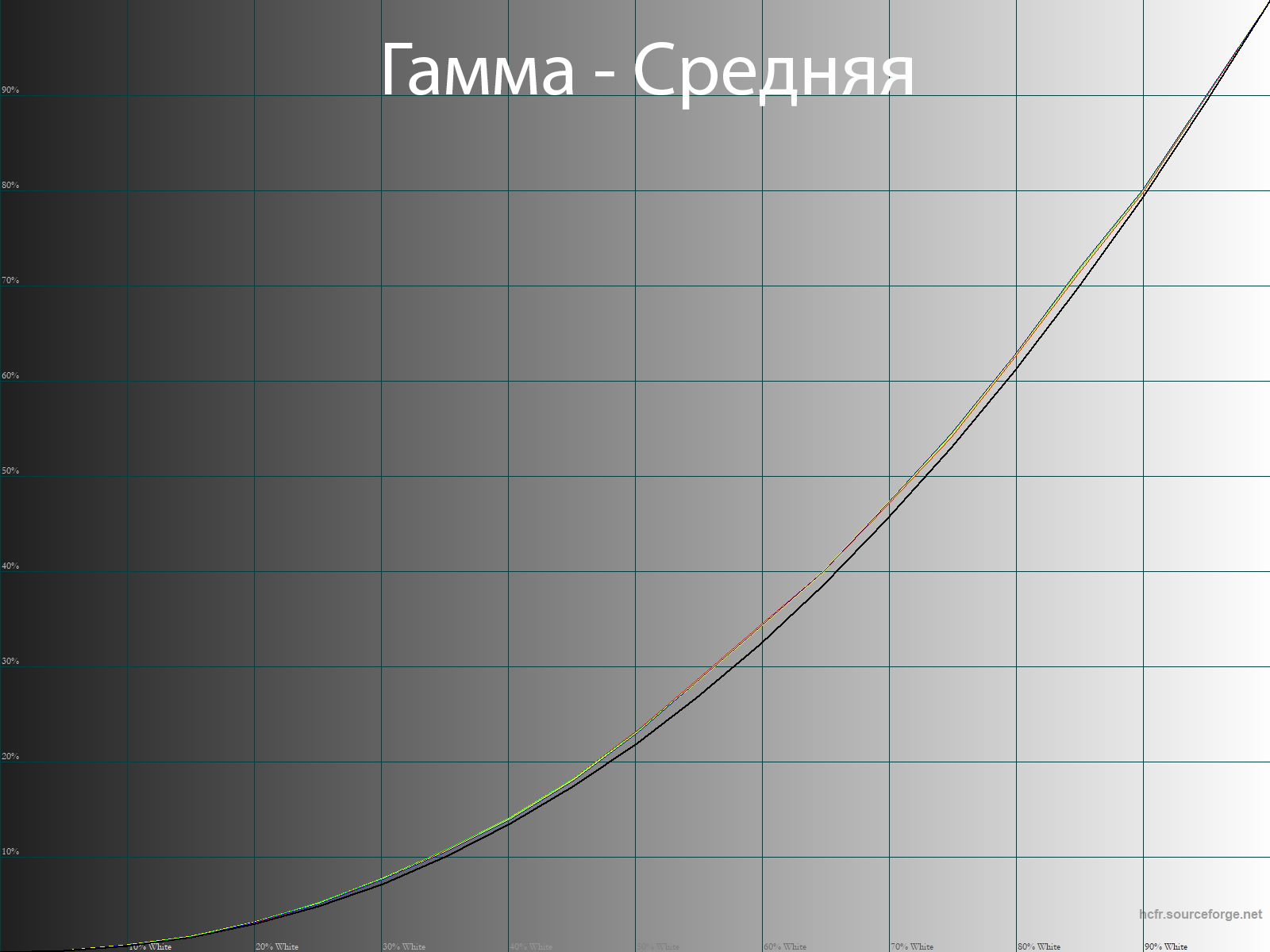 Ниже приведен спектр для белого поля (белая линия), наложенный на спектры красного, зеленого и синего полей (линии соответствующих цветов) для режима экрана «Персональный» с полной цветовой гаммой: