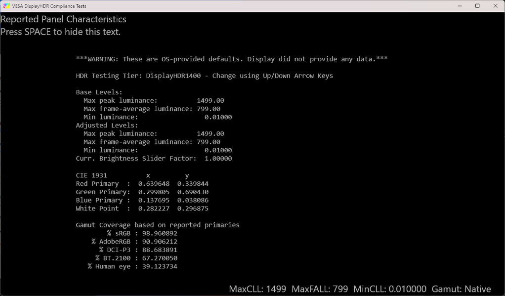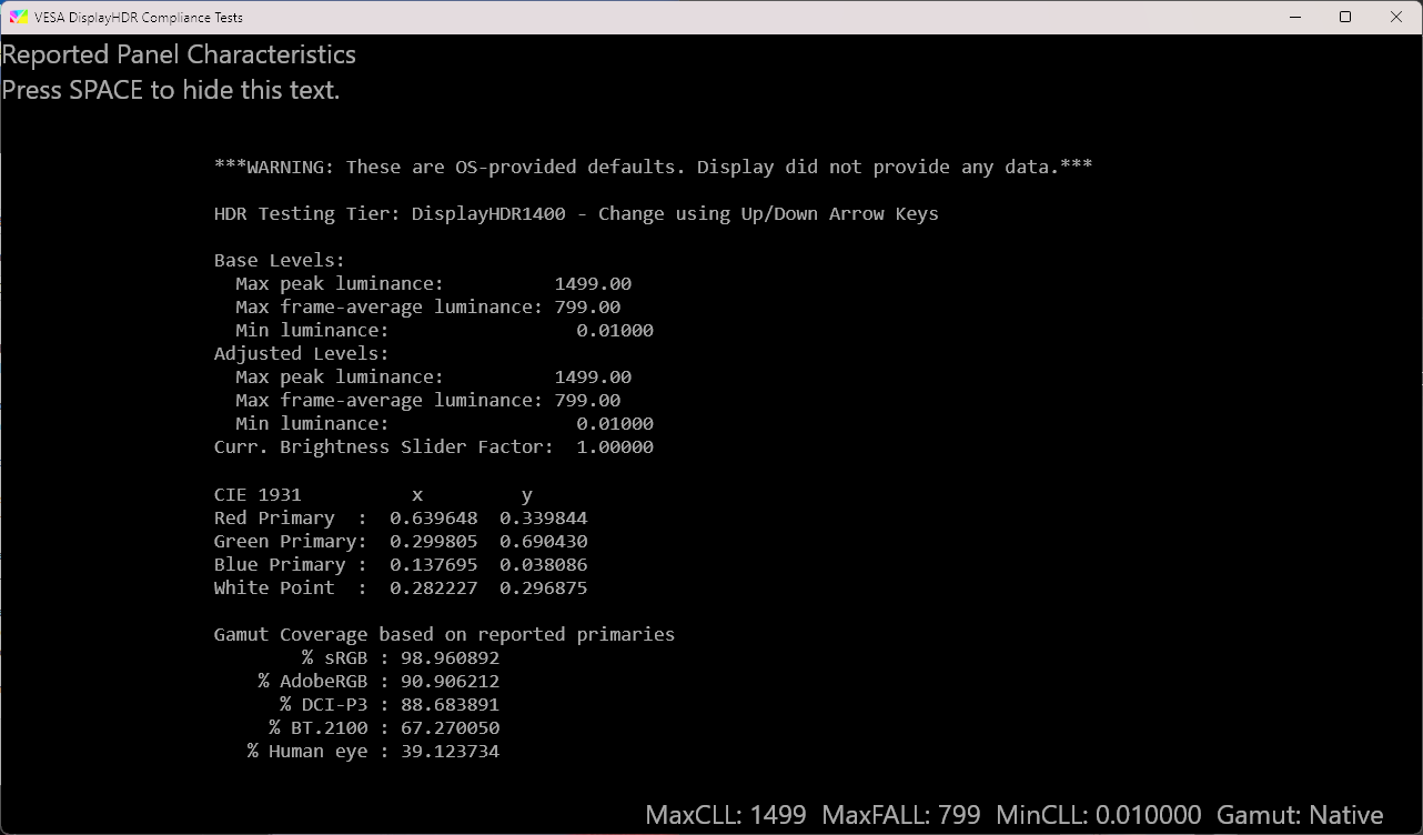 Стоит отметить, что исходя из данных, отмеченных в разделе «Сведения о дисплее», а также специальной отметки в информационном блоке утилиты VESA DisplayHDR Test, телевизор не передает полноценно всю необходимую информацию о своих возможностях по работе с HDR-контентом, а данные по пиковой яркости меняются в зависимости от выставленных настроек изображения и, видимо, неких других процессов, происходящих в связке ПК + телевизор.