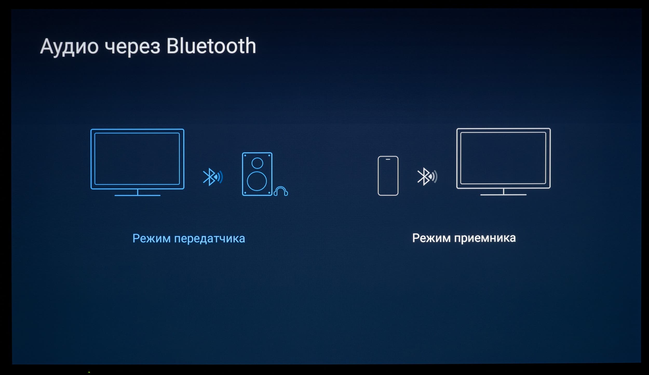 Есть встроенная возможность передачи аудио по каналу Bluetooth, которую можно запустить через отдельное микроприложение. В этом случается активируется стандартный (заводской) проигрыватель аудиофайлов. Во время его работы экран телевизора можно выключить с помощью отдельной функции.