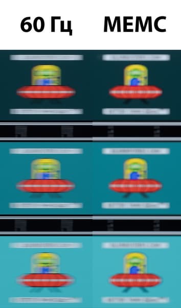 Для наглядного представления о том, что на практике означает такая скорость матрицы и какие могут быть артефакты от разгона, приведен снимок выше, полученный с помощью движущейся камеры. Подобные снимки показывают, что́ видит человек, если он следит глазами за двигающимся на экране объектом. Видно, что при прочих равных условиях четкость изображения значительно повышается при активации функции MEMC, на которую в Hyundai делают большую ставку, указывая для своего OLED-телевизора частоту 120 Гц. Еще раз напомним, что подобная частота в данном случае является не настоящей и получена с помощью интерполяции — дорисовки недостающих кадров с помощью специальной функции.