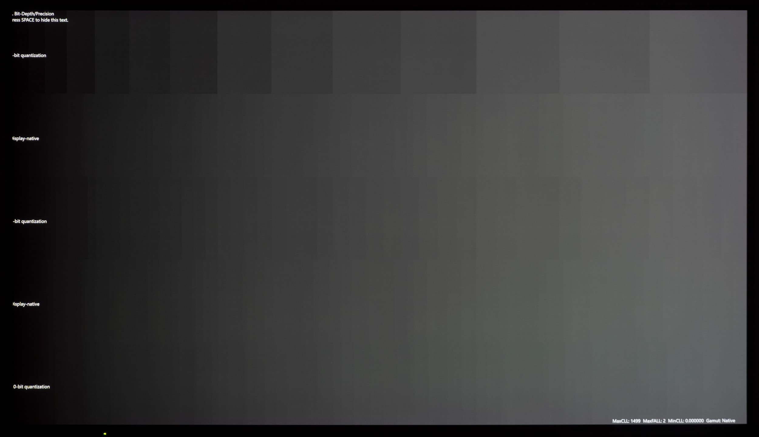 Воспроизведение тестовых видеороликов с 10-битным цветом и плавными градиентами показало, что заметность переходов между оттенками гораздо ниже, чем при простом 8-битном выводе без HDR. Цвета контента HDR более насыщенные, чем в случае отключения HDR, что вполне ожидаемо. Установка же 12-битного вывода к росту качества градиентов не приводит.