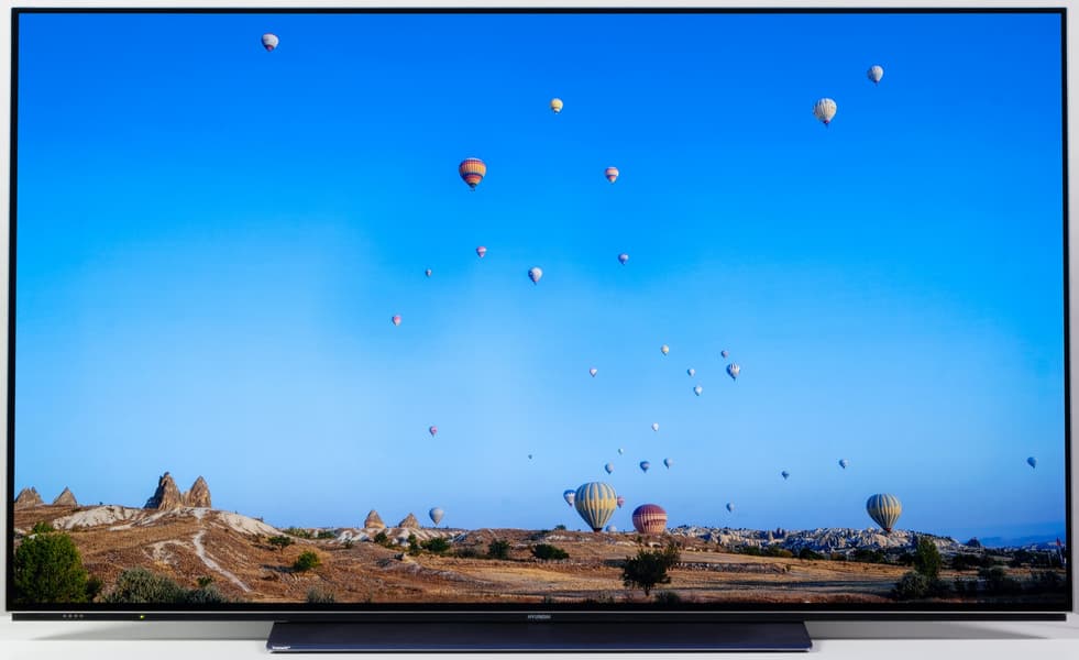 Телевизор Hyundai оснащен W-OLED-матрицей, обеспечивающей великолепные углы обзора и общую стабильность картинки по площади экрана. Отметим очень плавное уменьшение яркости при отклонении от перпендикуляра к экрану во всех трех направлениях.