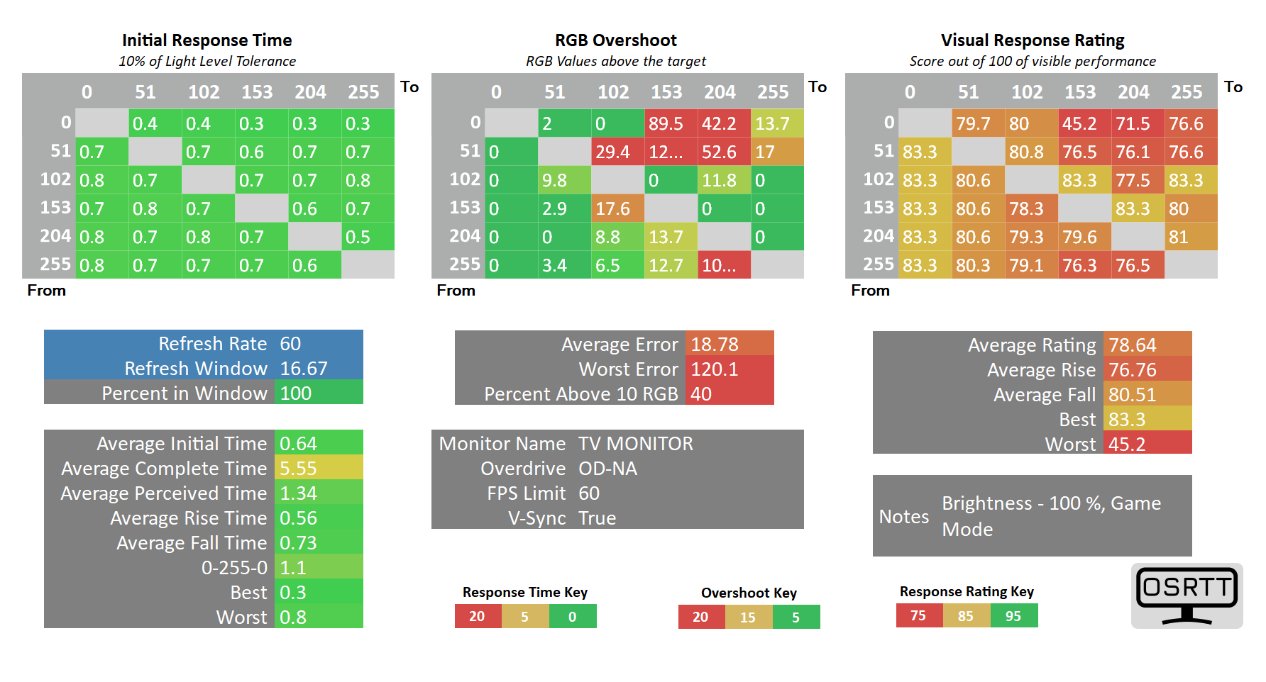 Такой скорости матрицы достаточно даже для очень динамичных игр, не говоря уже о других задачах. Отдельно отметим, что реальное время отклика протестированного ТВ на некоторых используемых переходах может быть даже ниже. Это связано с аппаратными ограничениями используемого прибора OSRTT, что теоретически снижает точность измерений сверхмалых времен отклика.