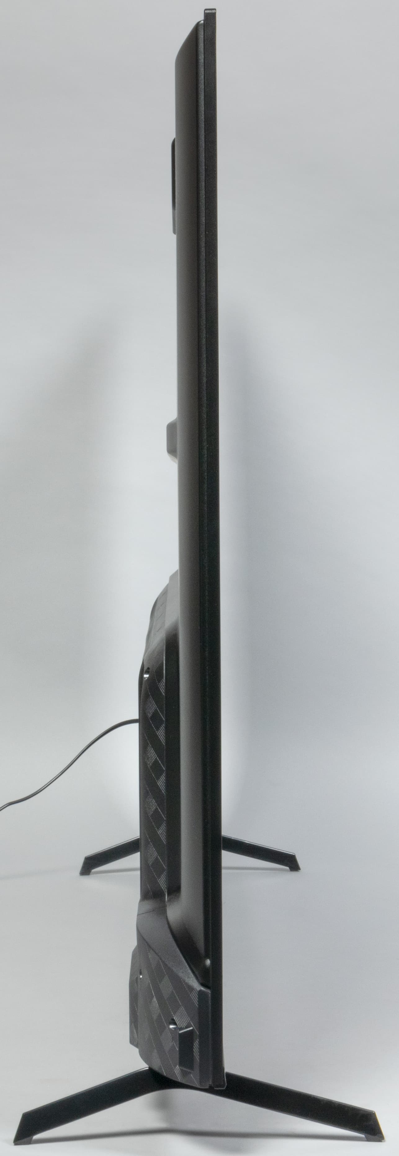 Опираются ножки на противоскользящие накладки из упругого пластика. Расстояние между крайними точками ножек 130,5 см. Жесткость конструкции соответствует весу телевизора. Телевизор стоит устойчиво, без видимого наклона.