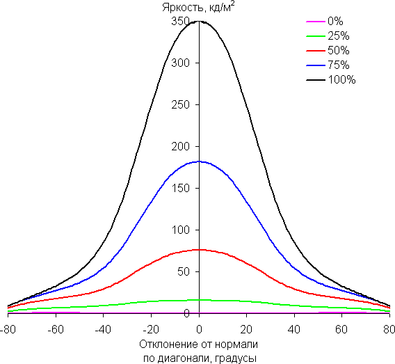 По скорости снижения яркости углы обзора неширокие. При этом в значимом диапазоне измеряемых углов графики яркости полутонов не пересекаются (то есть нет инвертирования яркости оттенков). Яркость черного поля при отклонении от перпендикуляра к экрану возрастает, но всего до примерно 0,13% от максимальной яркости белого поля и только при большом отклонении. Это очень хороший результат. Контрастность в диапазоне углов ±82° для двух направлений значительно превышает 10:1. Для диагонального направления контрастность при отклонении снижается быстрее, но все равно не опускается за эту отметку.