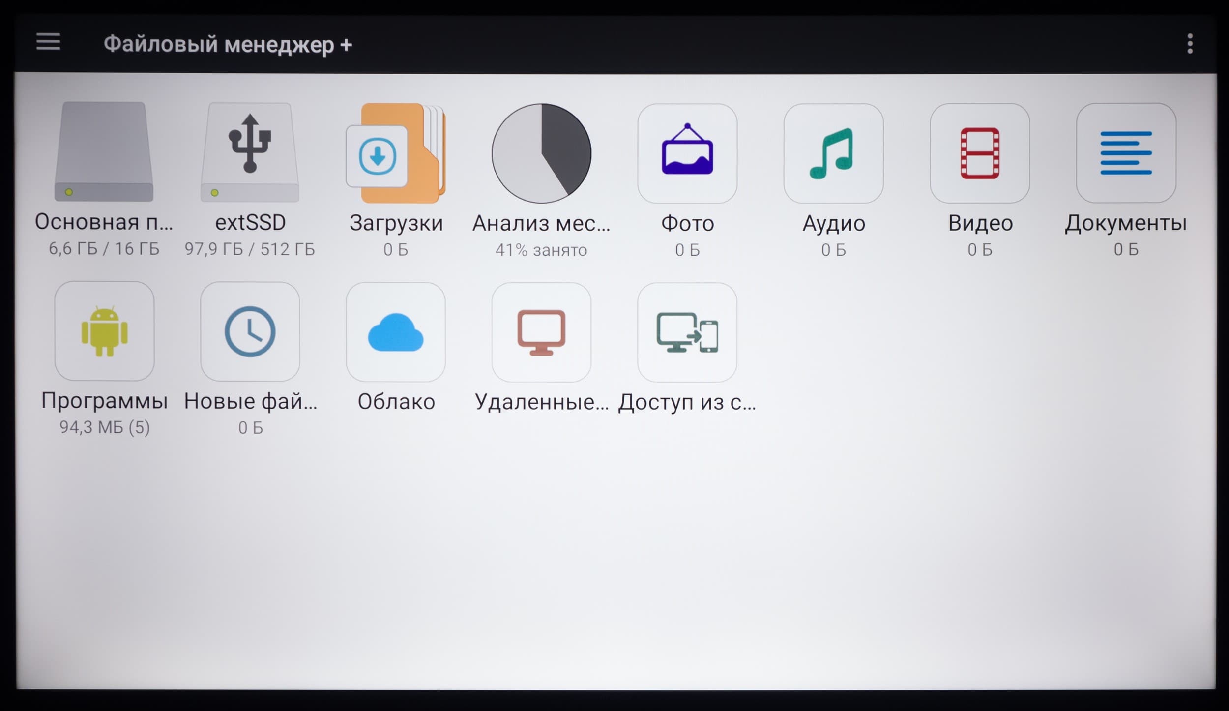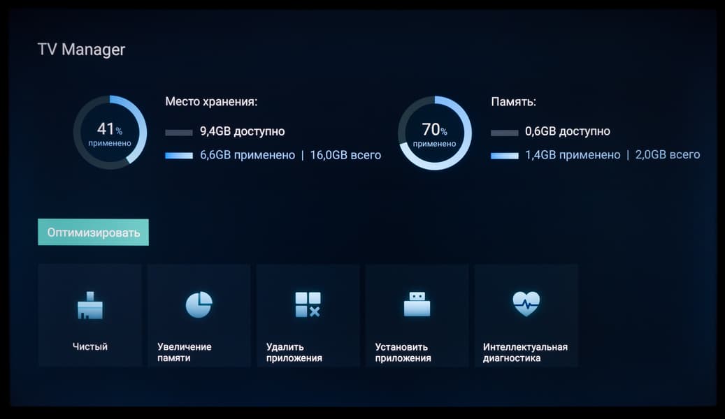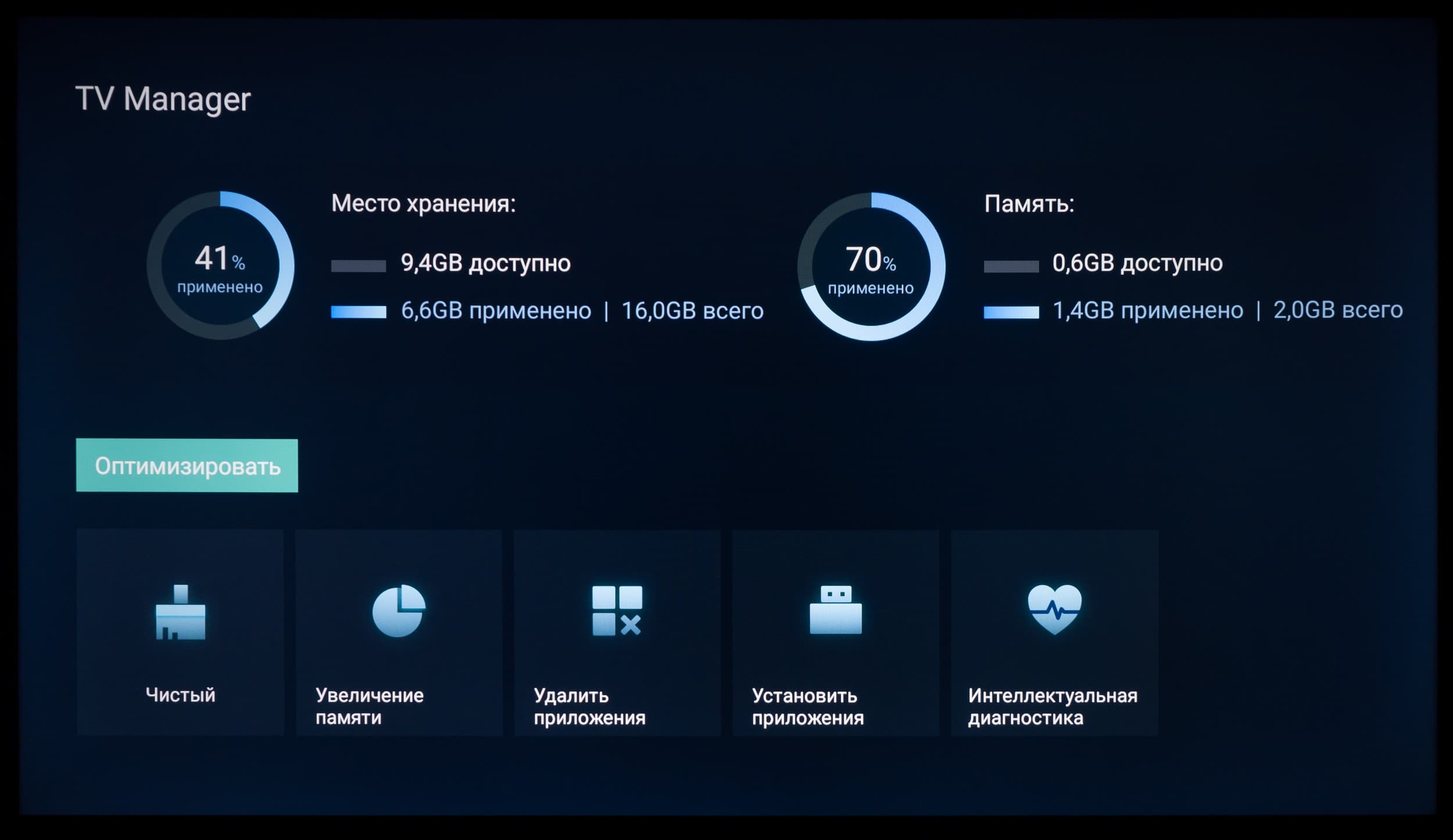 Уже знакомый встроенный в телевизор TV Manager обеспечивает быстрый доступ к различным очисткам системы, ее диагностики, установке и удалению приложений. При подключении внешнего накопителя система уведомляет о его обнаружении и при наличии нескольких вариантов «Проводников» предлагает установить необходимый по умолчанию.