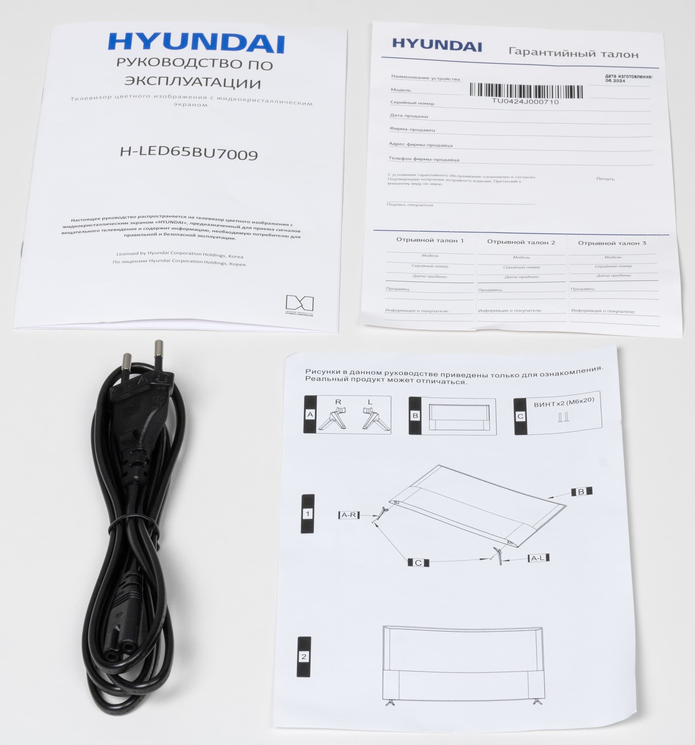 Упакован телевизор Hyundai и всё к нему в скромно оформленную коробку из гофрированного картона. С двух сторон упаковки отмечены самые важные технические особенности модели. Для переноски в коробке проделаны боковые прорезные ручки. Комплект поставки стандартный — для начала работы с ТВ есть всё необходимое.