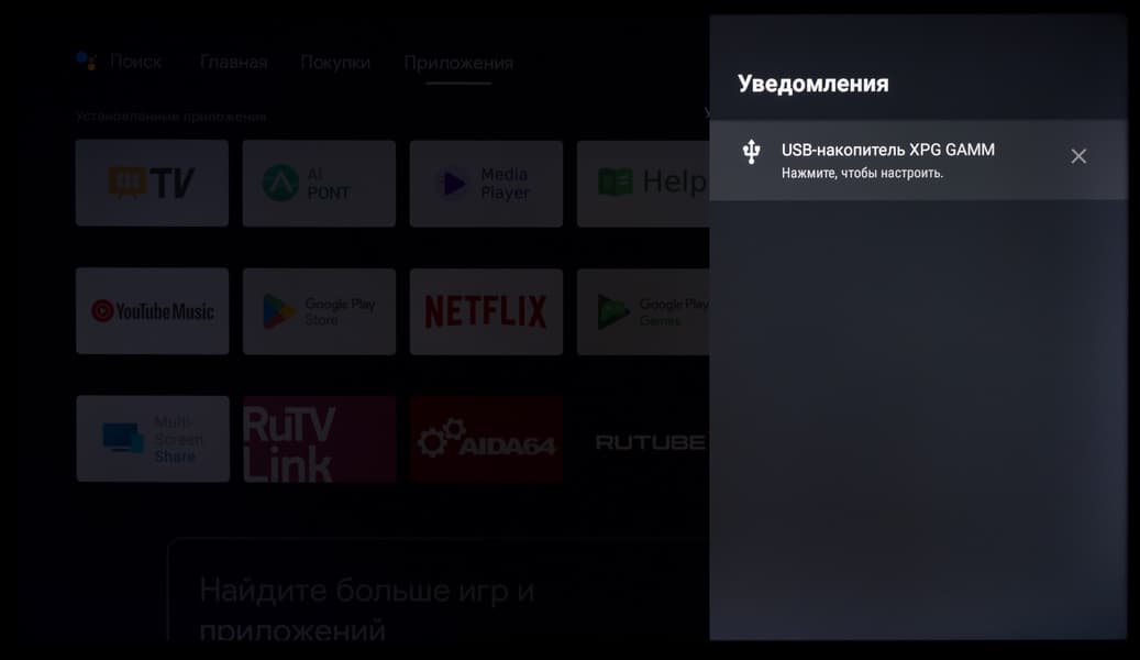 В ходе тестирования выяснилось, что телевизор после установки последнего доступного обновления (от начала марта 2024 года на момент тестирования) полноценно поддерживает USB-накопители с файловыми системами NTFS и FAT32, а с кириллическими названиями файлов и папок проблем не возникает. При подключении флэш-накопителя с файловой системой exFAT телевизор указал на некорректность работы и предложил произвести его форматирование.