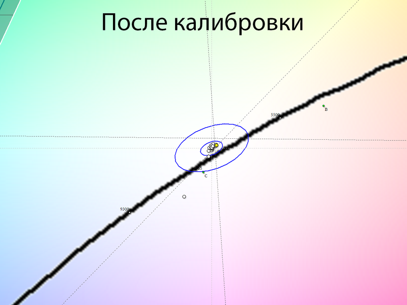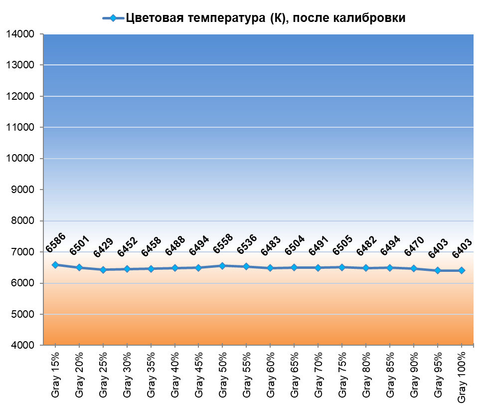 После калибровки точка белого и все точки серого клина пришли в норму, баланс изображения сохранился нейтральным, а стабильность ЦТ серого клина стала чуть выше.