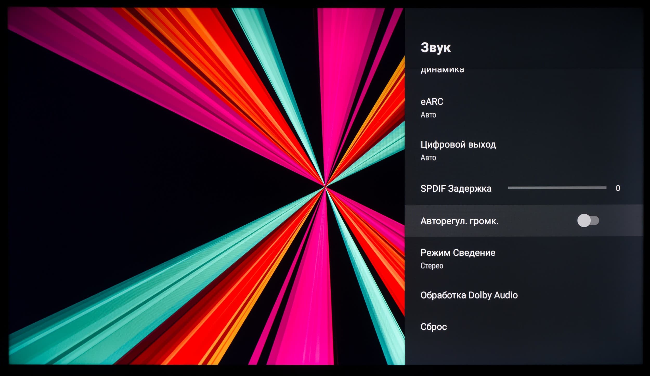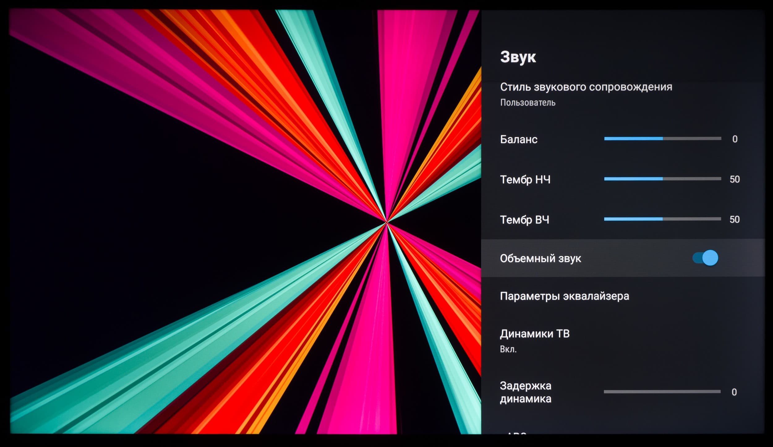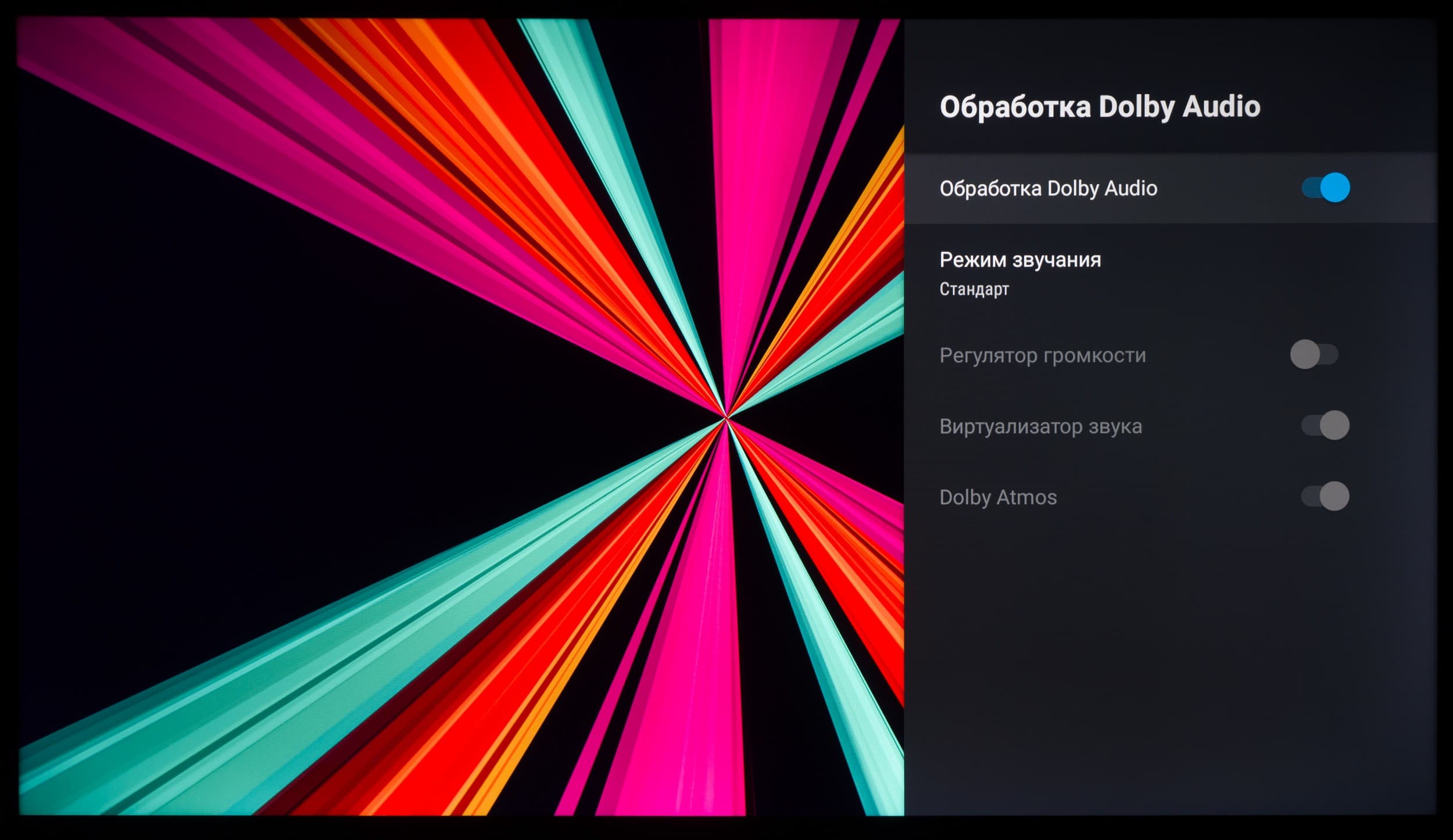 В разделе «Звук» ОС есть предустановленные режимы эквалайзера, а также доступна ручная регулировка баланса, корректировка низких и высоких частот, активация функций «Объемный звук» (есть положительные изменения) и автоматического управления громкостью (актуально для источников с сильно отличающимся уровнем аудиосигнала), выбор цифрового выхода, включение обработки Dolby Audio со своими дополнительными параметрами.