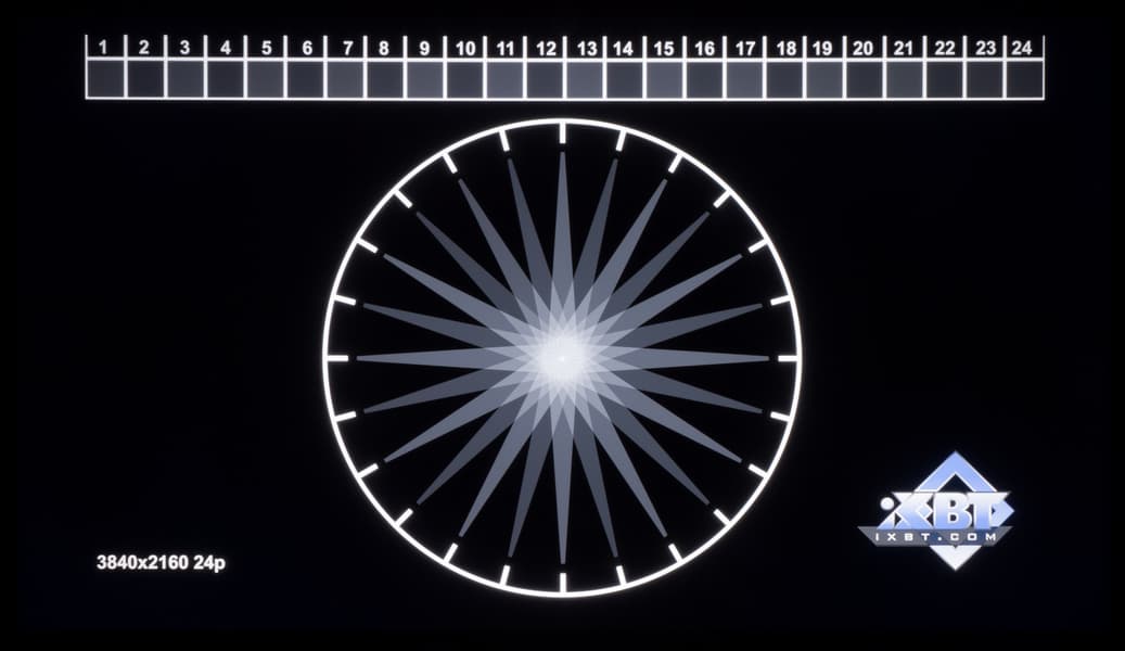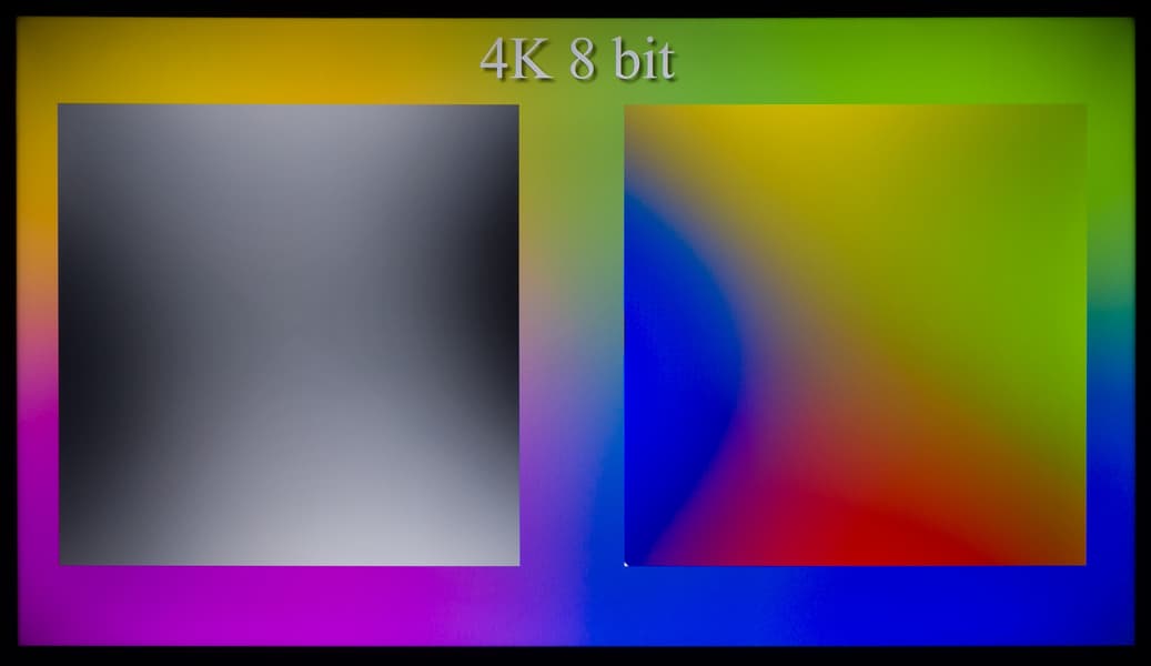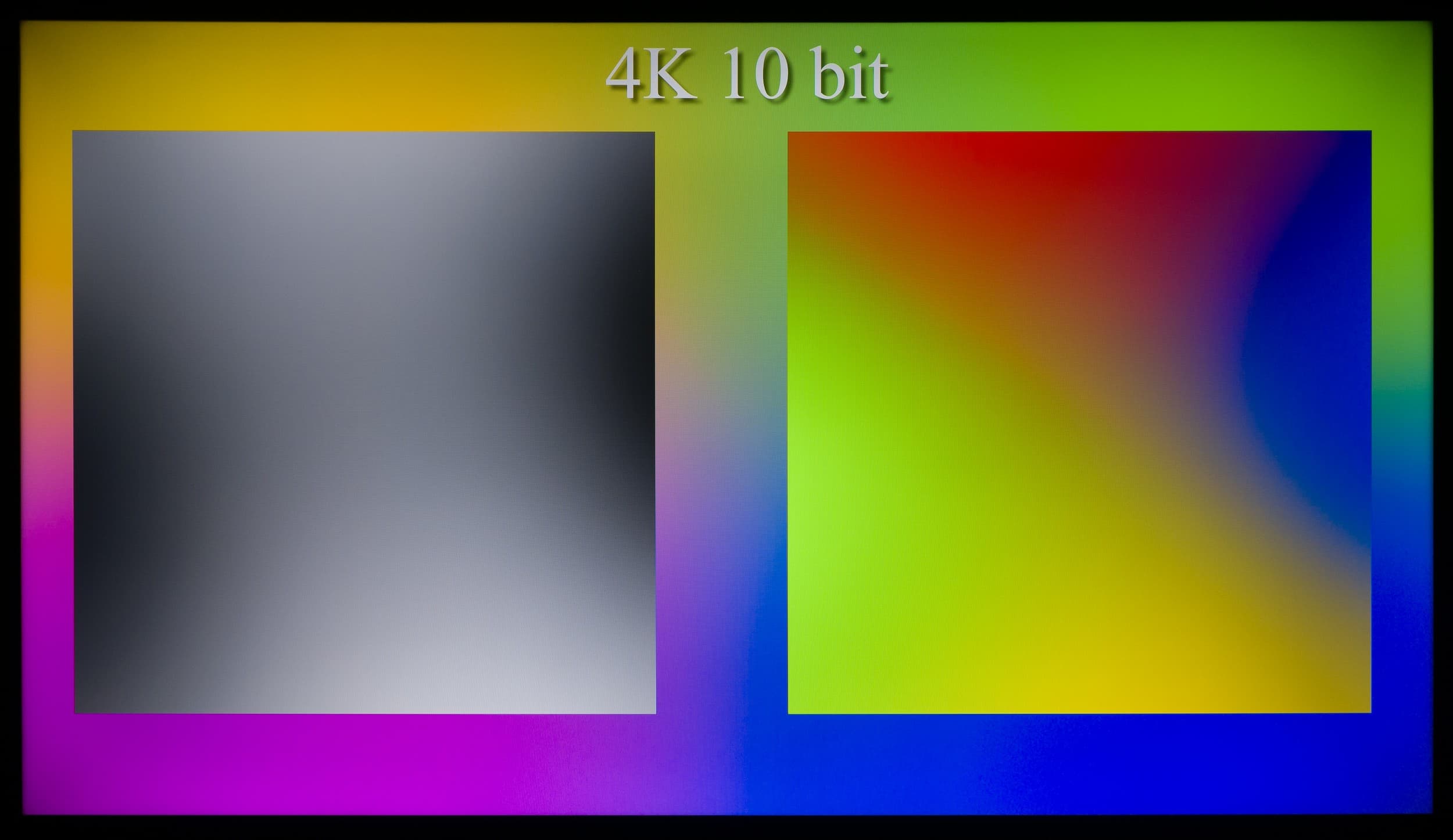 Наглядно видно, что телевизор способен выводить градиенты в 10-битном режиме более качественно, чем в стандартном 8-битном. Но в большей степени это будет актуально при выводе HDR-контента с соответствующими требованиями к ТВ. Использование же программной эмуляции до 12 бит через драйвер видеокарты не приносит видимых преимуществ над 10-битным выводом сигнала.