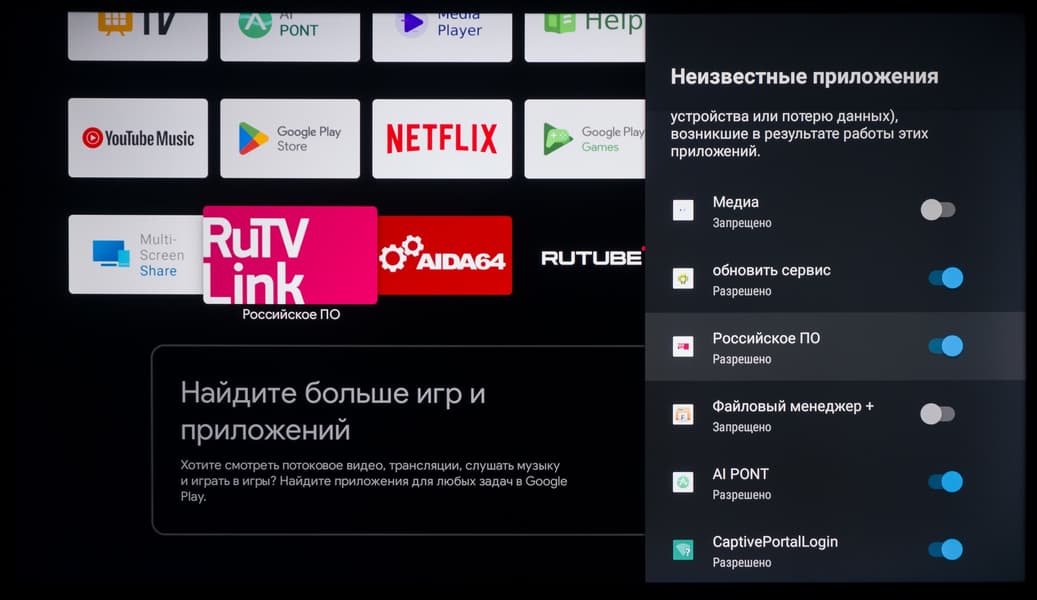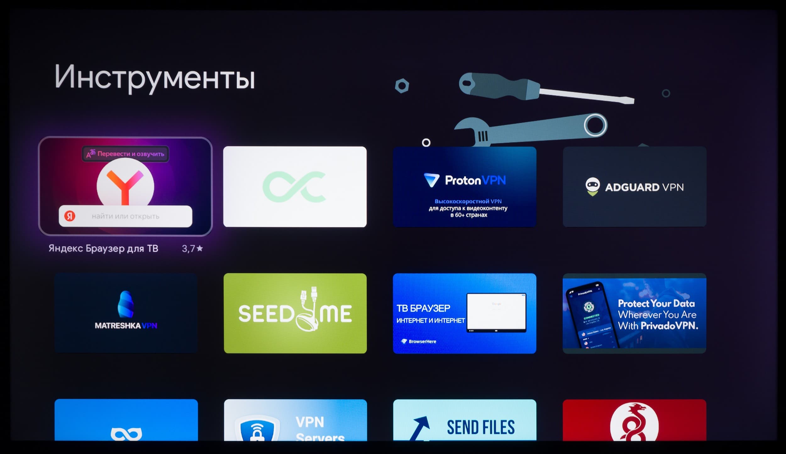 В телевизоре предустановлено достаточное количество приложений, часть из которых растеряла свою актуальность на территории РФ. Но уже хорошо известное нам приложение RuTV Link в котором можно быстро найти всё необходимое российское ПО (браузер Яндекс, различные стриминговые сервисы и онлайн-кинотеатры). Список приложений постоянно пополняется — обновления выходят часто.