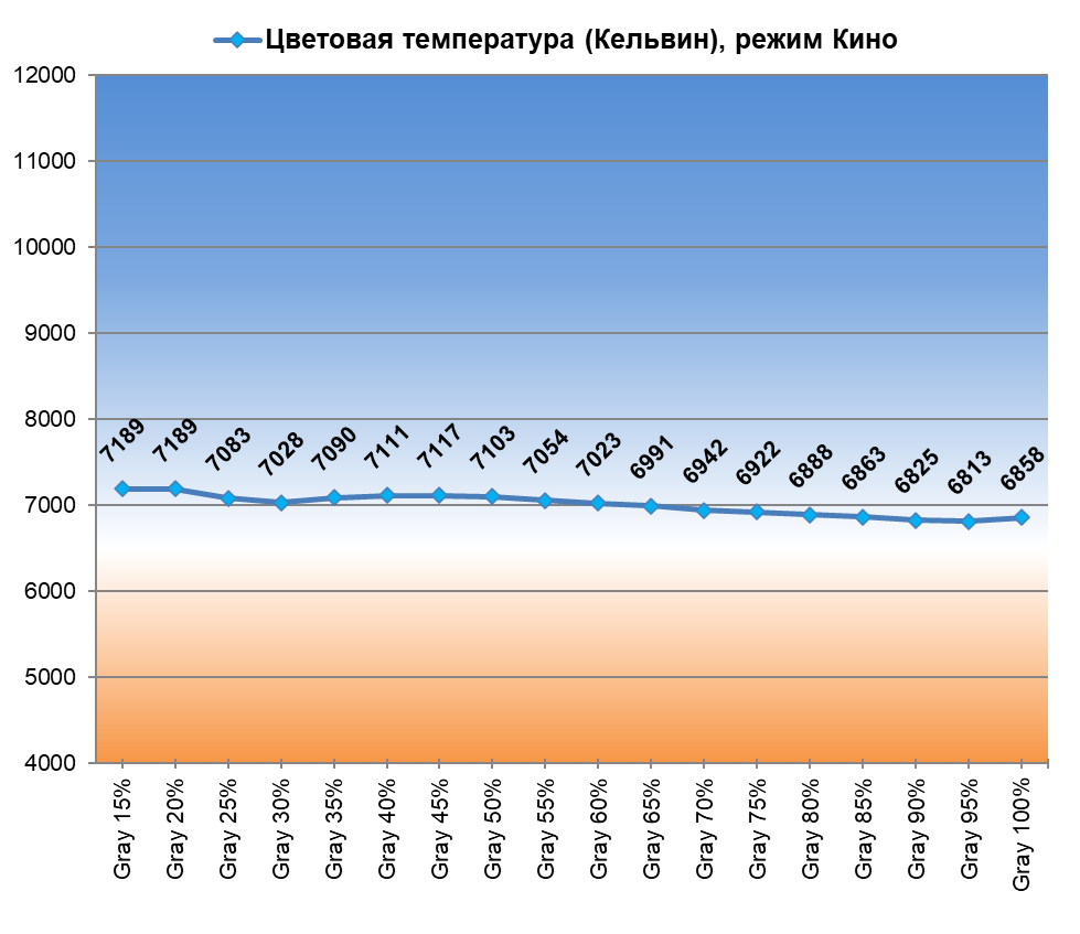 В случае двух заводских режимов телевизор смог продемонстрировать вполне адекватную стабильность ЦТ оттенков серого, без проявления паразитных оттенков.