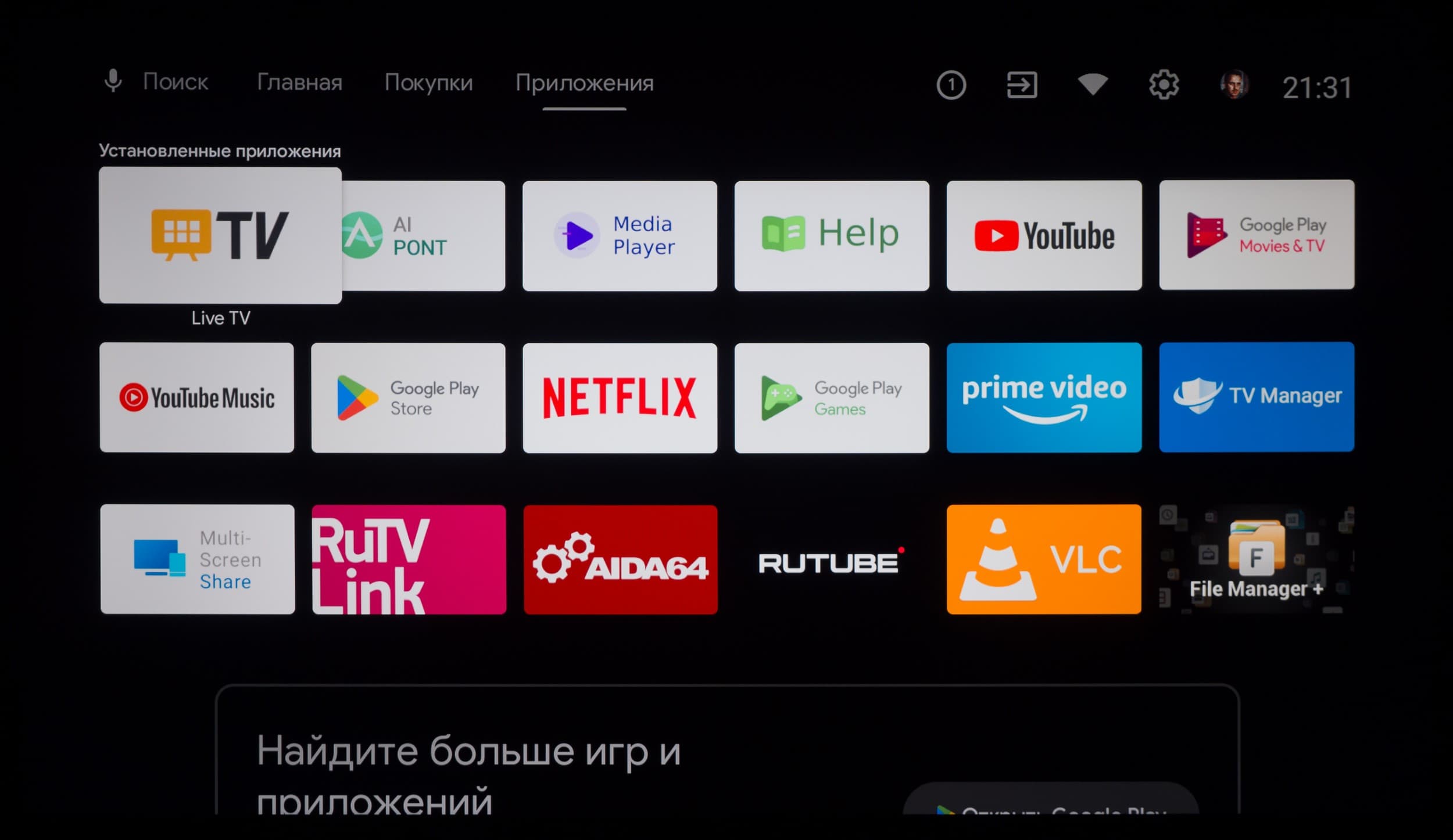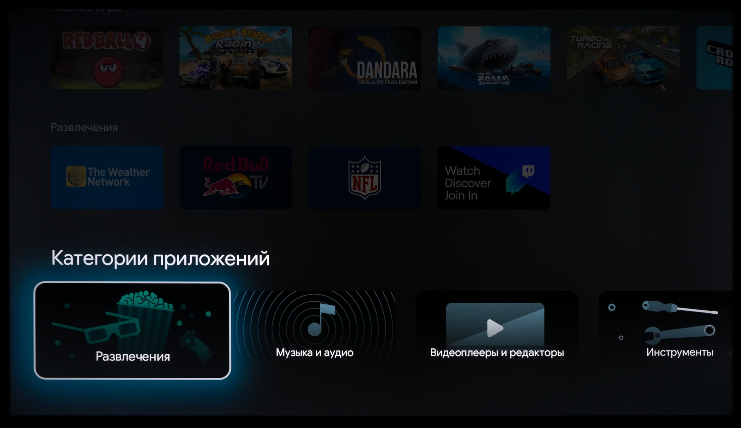 В самом же Google Play официально доступных приложений для платформы Android TV не так много, но пользователя это практически не ограничивает, ведь телевизор способен переварить многие подходящие для используемой программно-аппаратной платформы APK-инсталляторы. Главное — чтобы на нужное вам приложение хватило мощности встроенной в ТВ начинки.