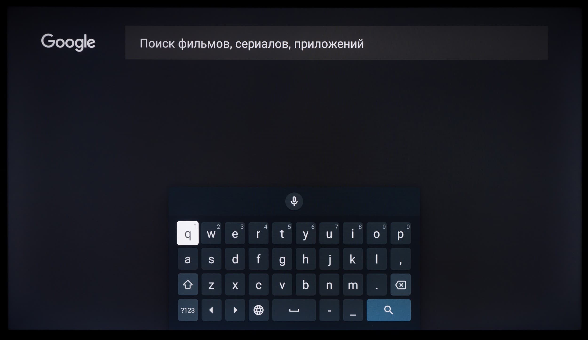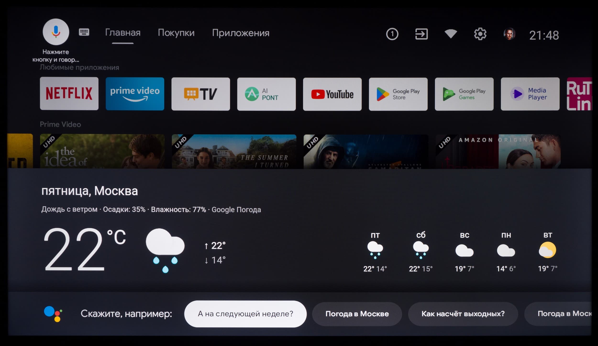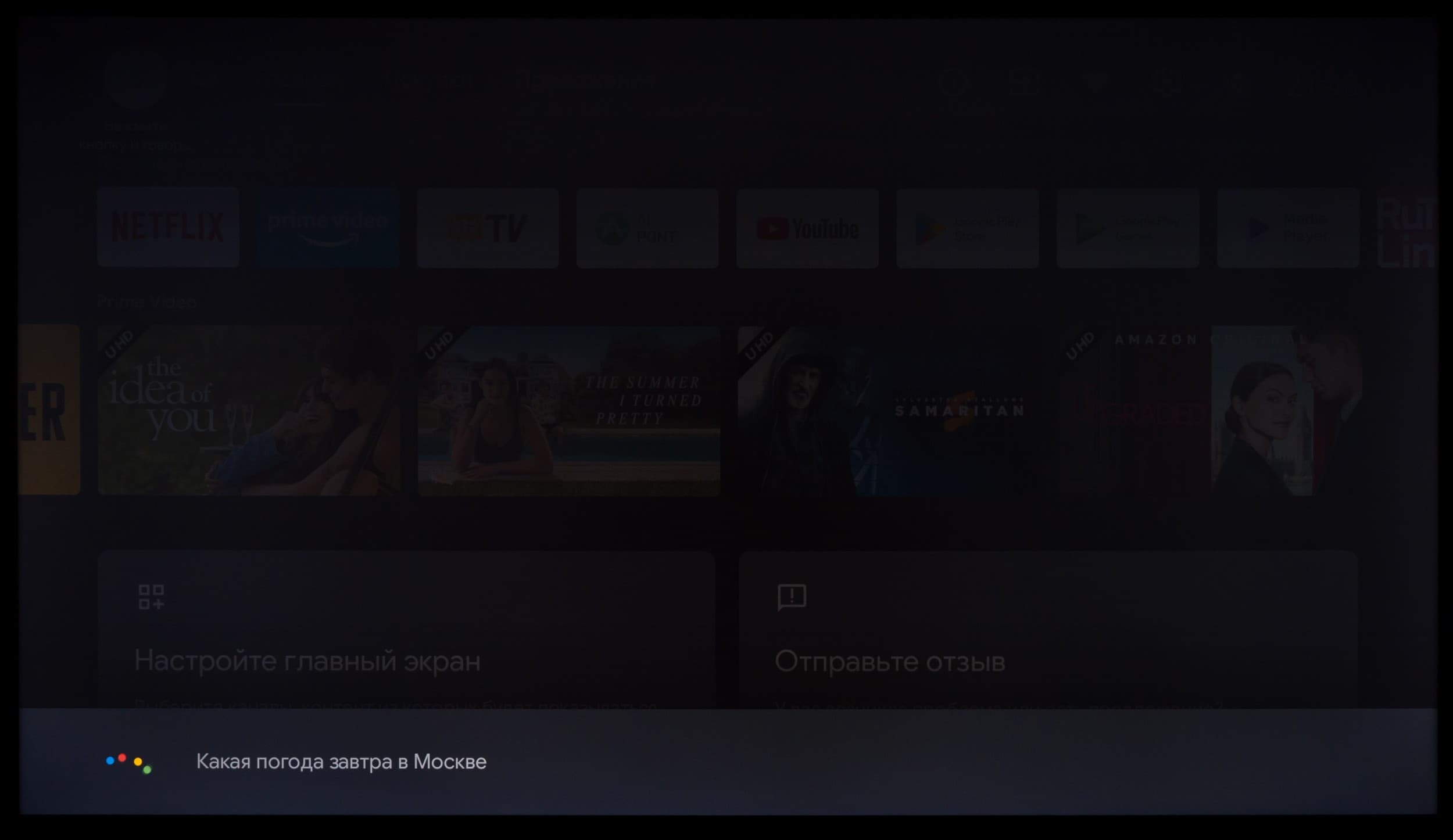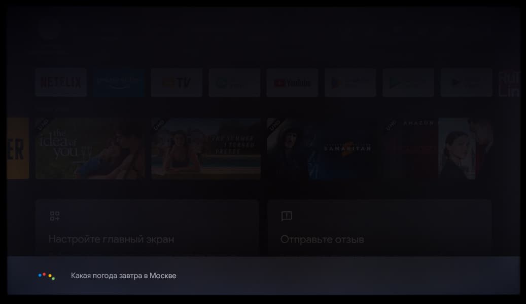 Голосовой помощник от Google запускается при нажатии на кнопку с цветным микрофоном (для ввода голосовой команды держать ее не нужно, а при включенном микрофоне на пульте горит красный индикатор), также его можно запустить с домашней страницы или нажатием на мультимедийную кнопку поиска на цифровой клавиатуре. Этот помощник поможет найти контент, который предоставляют ряд программ, и ответить на какие-то вопросы (показывает и проговаривает ответ), например, какая сейчас погода за окном. Пульт желательно держать поближе к себе, поскольку встроенный в пульт ДУ микрофон не является высокочувствительным.