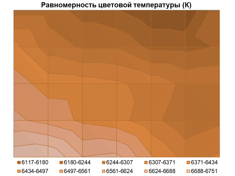 Гораздо меньше нареканий у нас к равномерности цветовой температуры: среднее отклонение от центральной точки составило 2%, максимальное — 5,1%, а вариация значений по полю экрана слегка перешла за 600 К, что может быть заметно и без использования измерительного оборудования. Тем более что характер изменения ЦТ у протестированного экземпляра ТВ особый — строго по диагонали.