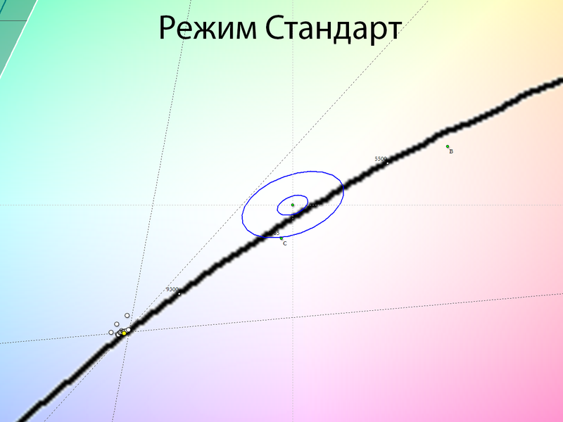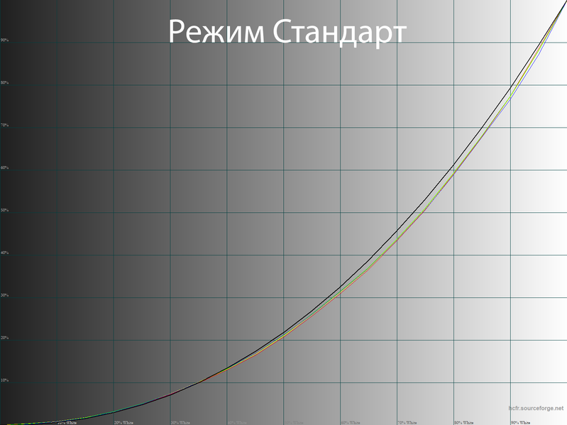 Ниже приведен спектр для белого поля (белая линия), наложенный на спектры красного, зеленого и синего полей (линии соответствующих цветов) для режима экрана «Стандарт» с полной цветовой гаммой: