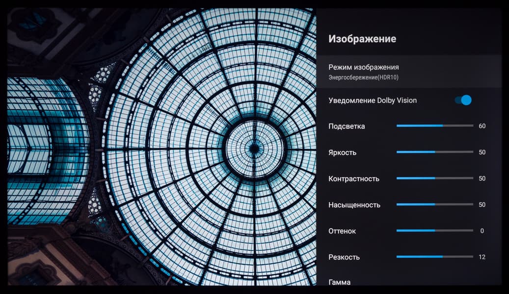 Отдельно пройдемся по режимам гаммы. Среди доступных пресетов по умолчанию выбран «Средний». На фоне двух других именно он выглядит оптимальным для постоянно использования и дальнейшей настройки. Если же есть желание несколько снизить или увеличить визуальную контрастность картинки на экране телевизора, то можете воспользоваться режимами «Светлая» (гамма 1,98) и «Темная» (гамма 2,36).
