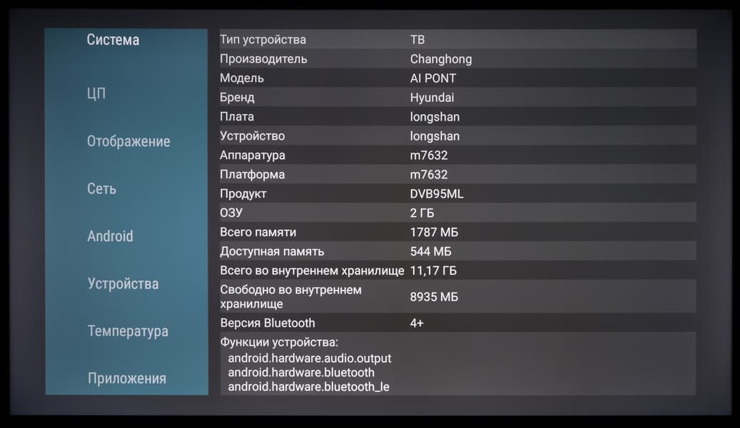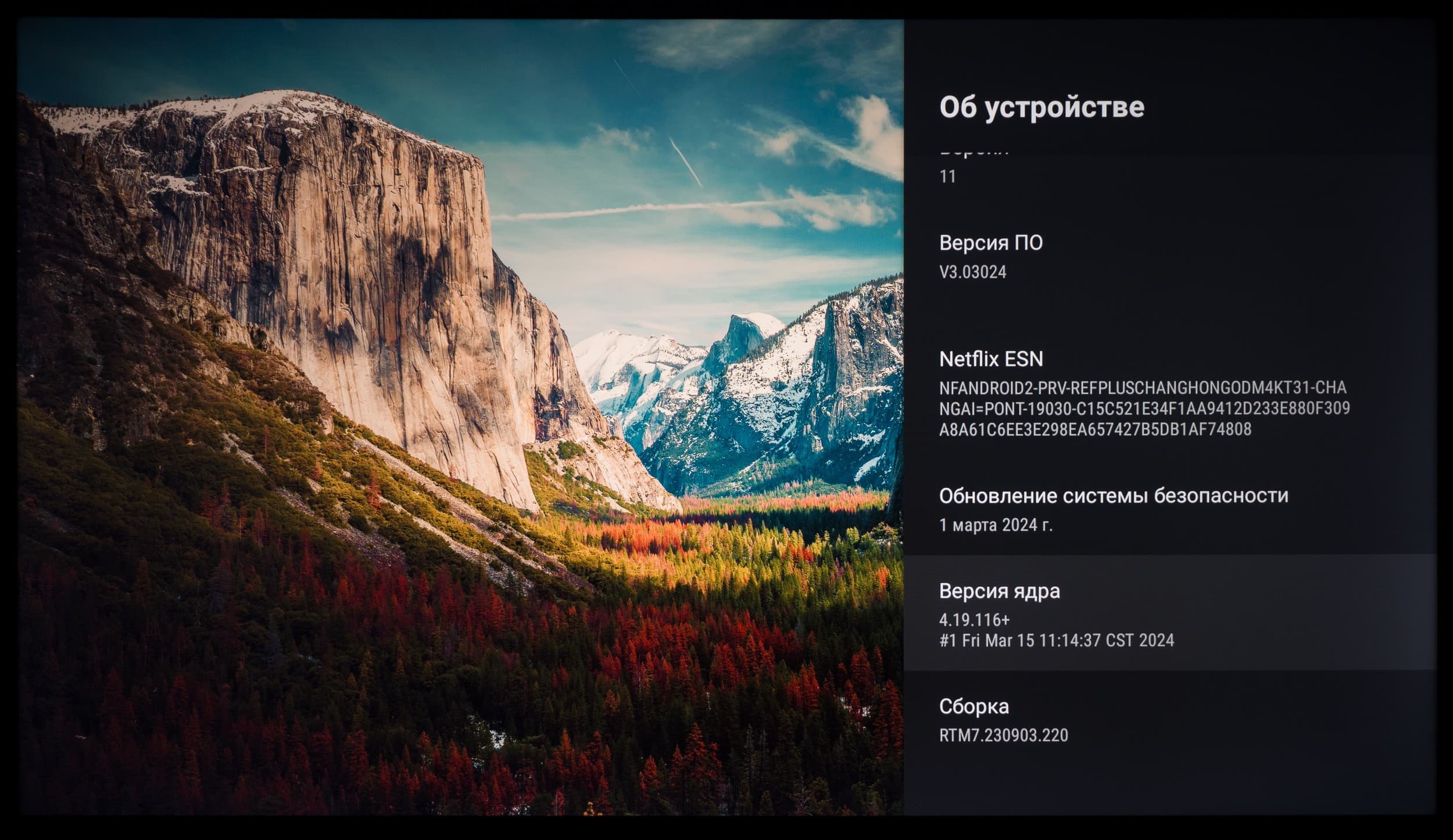 Рассматриваемый телевизор Hyundai H-LED65BU7009 работает под управлением платформы Android TV, в данном случае основанной на Android версии 11 (она же обозначается производителем как Android R — Red Velvet) с последним обновлением от начала марта 2024 года.