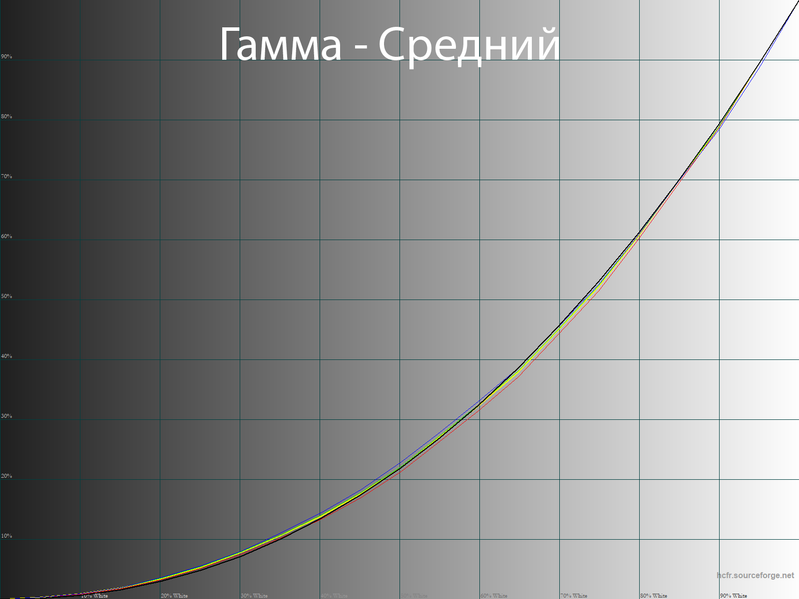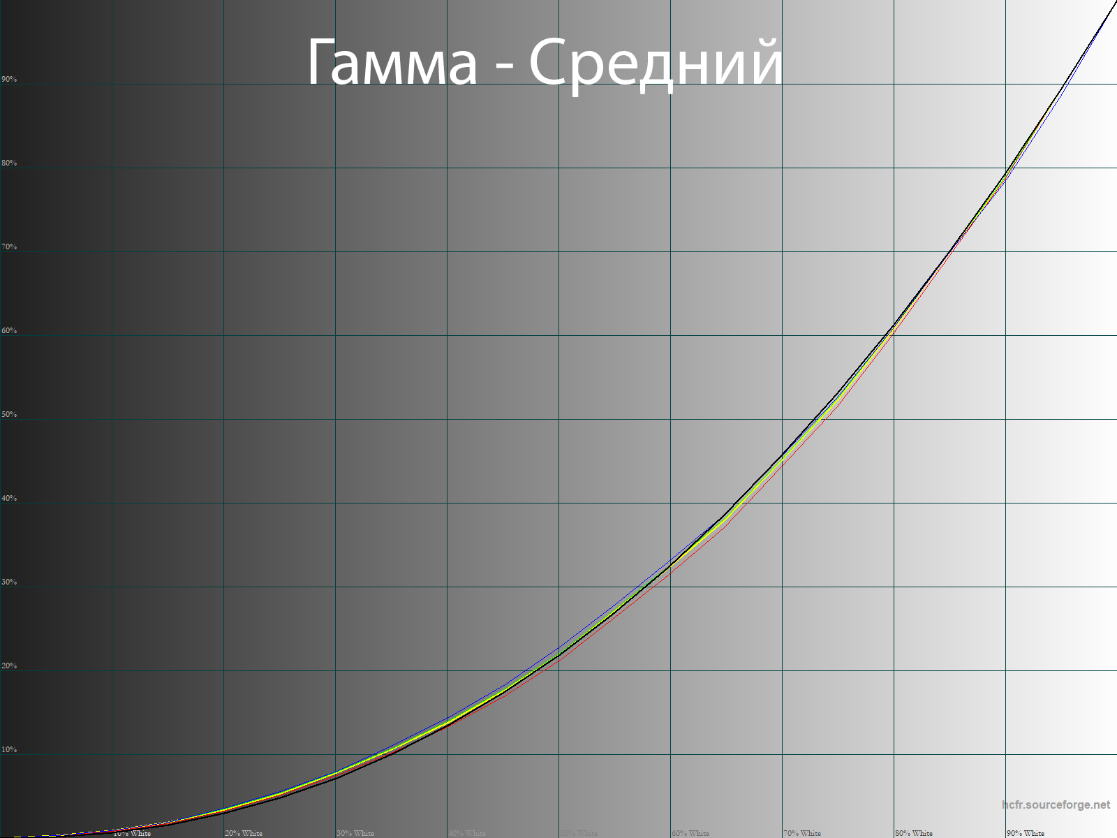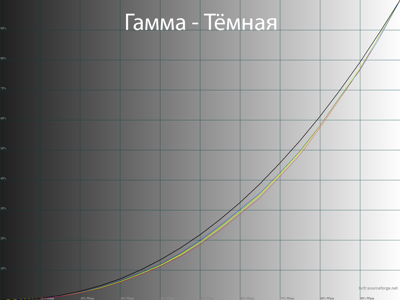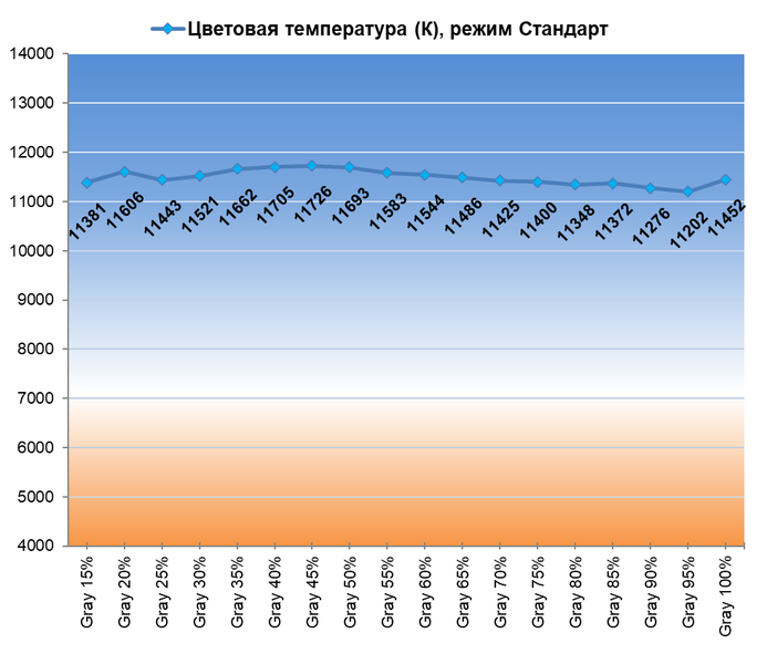 По полученным гамма-кривым при настройках по умолчанию можно судить о слегка завышенной общей контрастности изображения в сравнении с референсом вместе с излишне проявленной различимостью самых глубоких теней, что свойственно многим современным представителям VA-семейства. Среднее значение гаммы для режима составило 2,25. Картинка холодная и с несколько увеличенной резкостью, которую следует выставить в 0 пунктов вместо 10 по умолчанию.